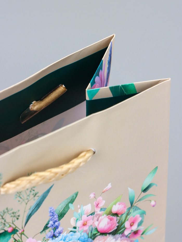 - Нежный женственный дизайн: Бежевый фон с цветочным орнаментом создает ощущение нежности и изящества. Этот пакет станет подходящим выбором для подарка девушке или женщине на 8 Марта, День рождения или 14 Февраля.