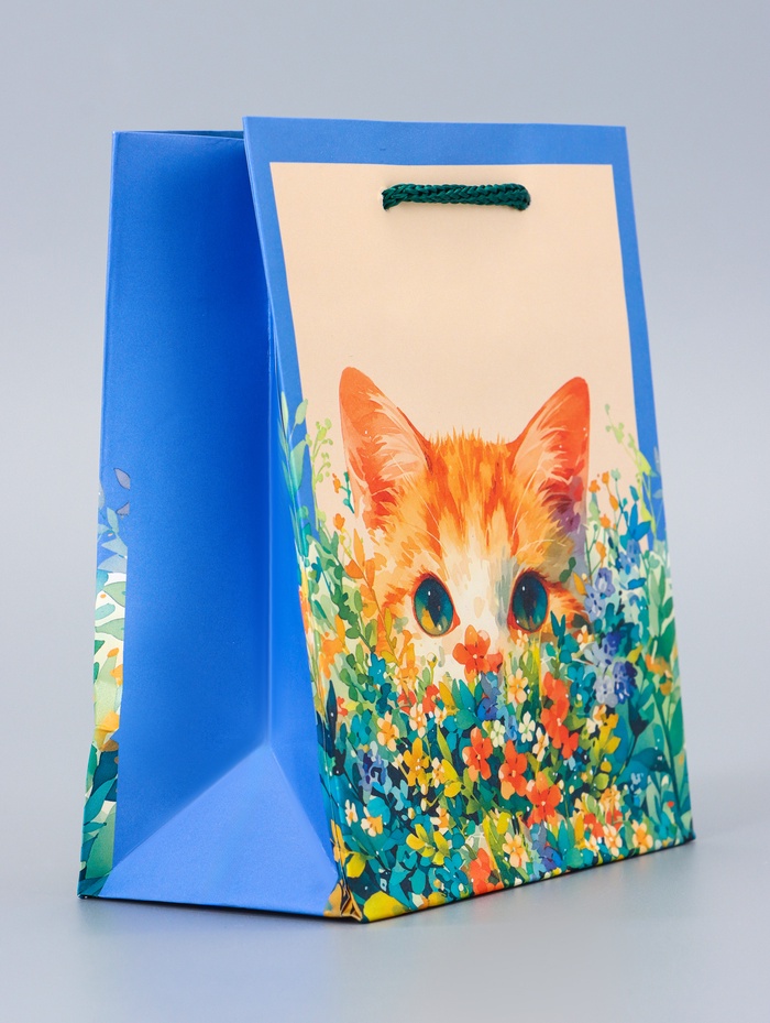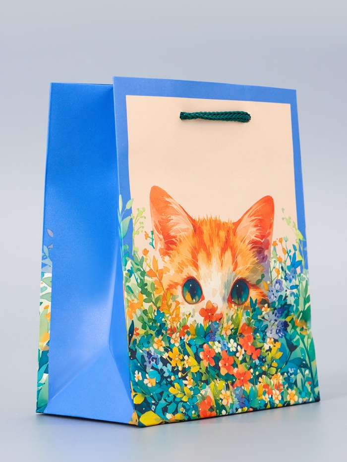 Подарочный пакет «Котик» малый – это компактная упаковка с милым дизайном для небольших подарков женщинам и девушкам. Пакет сочетает цветочные мотивы с очаровательным образом кота.