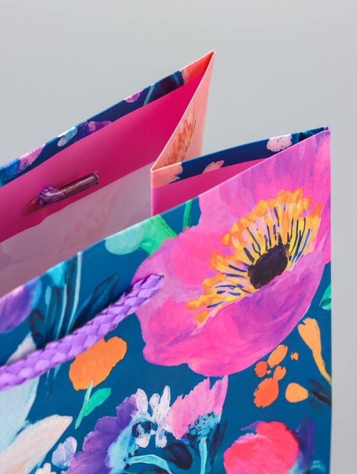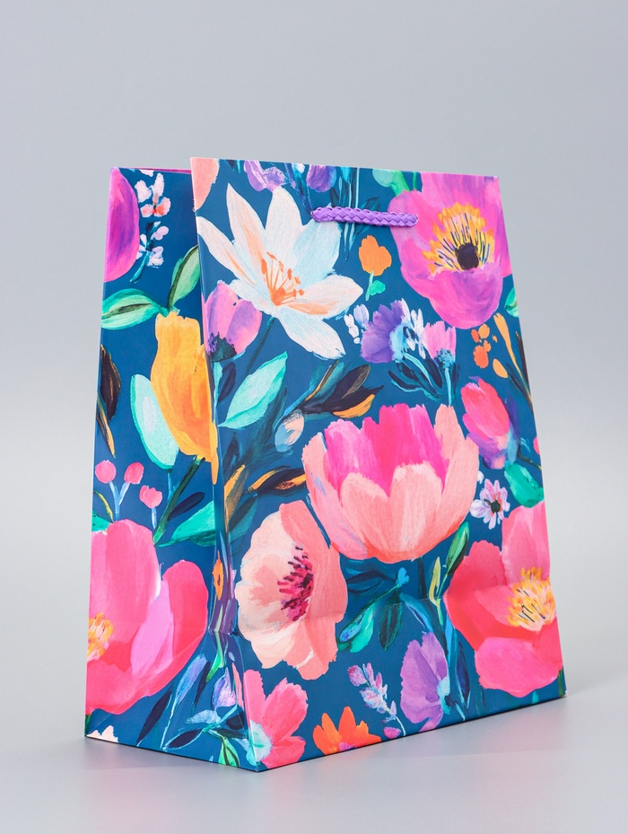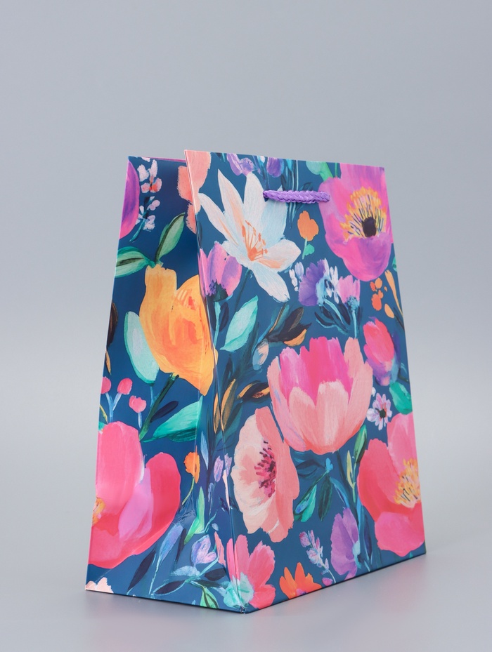 Подарочный пакет «Магия цветов» — это ламинированная упаковка среднего размера с глубоким синим фоном и изысканным ботаническим принтом. Он создает ощущение таинственности и стиля, превращая обычный подарок в значимый жест внимания.