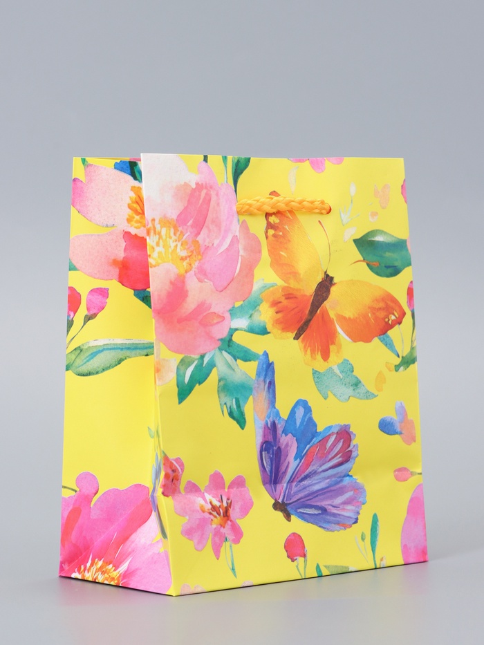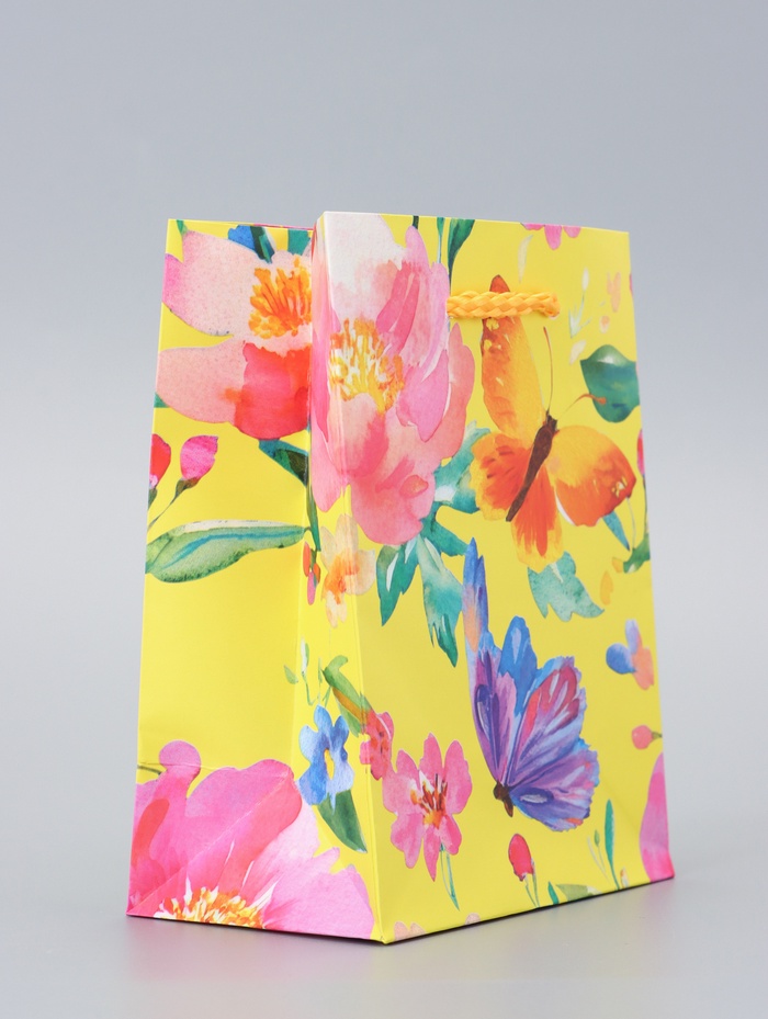 Подарочный пакет «Мечта» — это небольшая ламинированная упаковка в солнечном желтом цвете с цветочными мотивами и летящими бабочками. Миниатюрный размер делает его практичным решением для небольших, но значимых подарков, где важна эстетика.