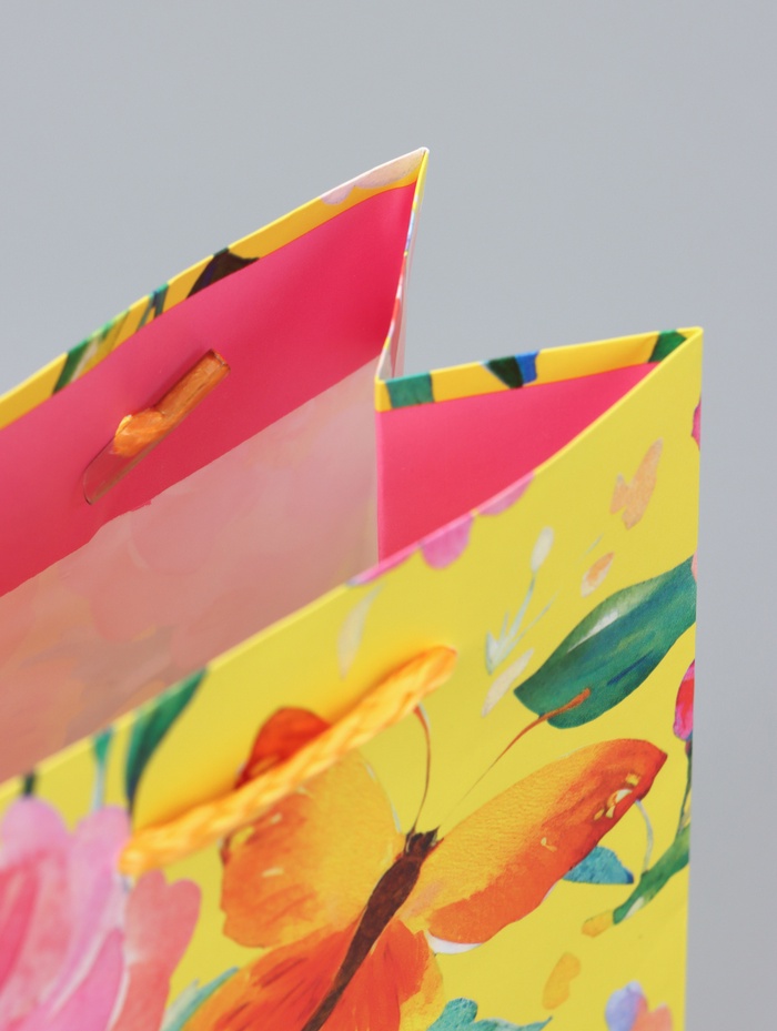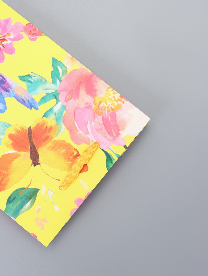 - Поэтичный дизайн: Желтый фон с цветами и бабочками создает ощущение легкости и воздушности. Этот пакет станет подходящим выбором для подарка девушке или женщине на 8 Марта, День рождения или как романтичный жест на 14 Февраля.