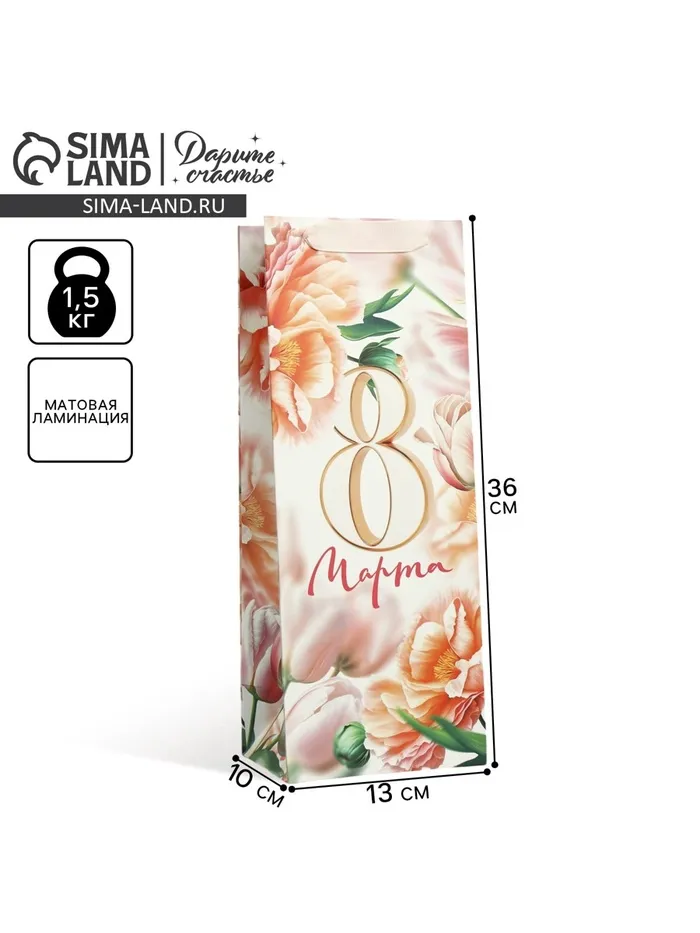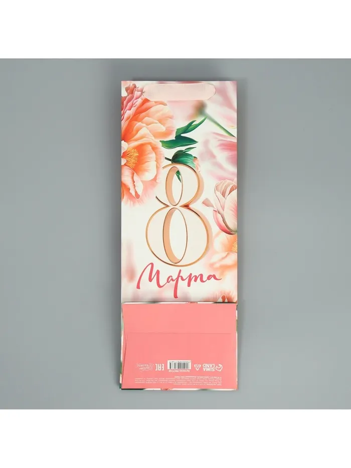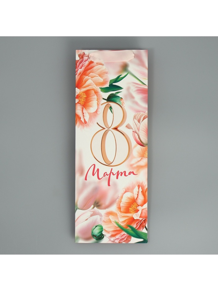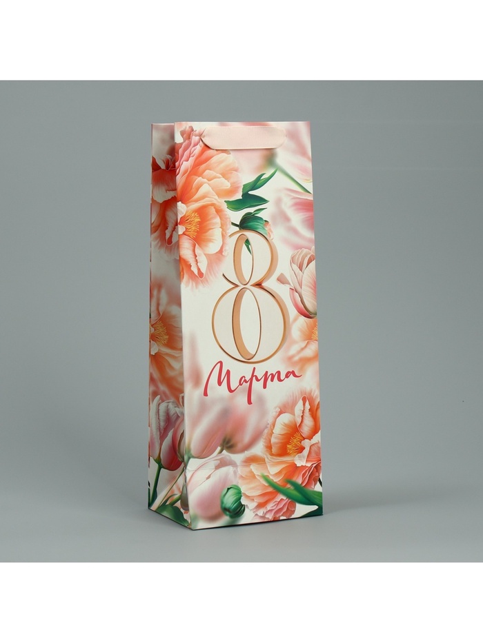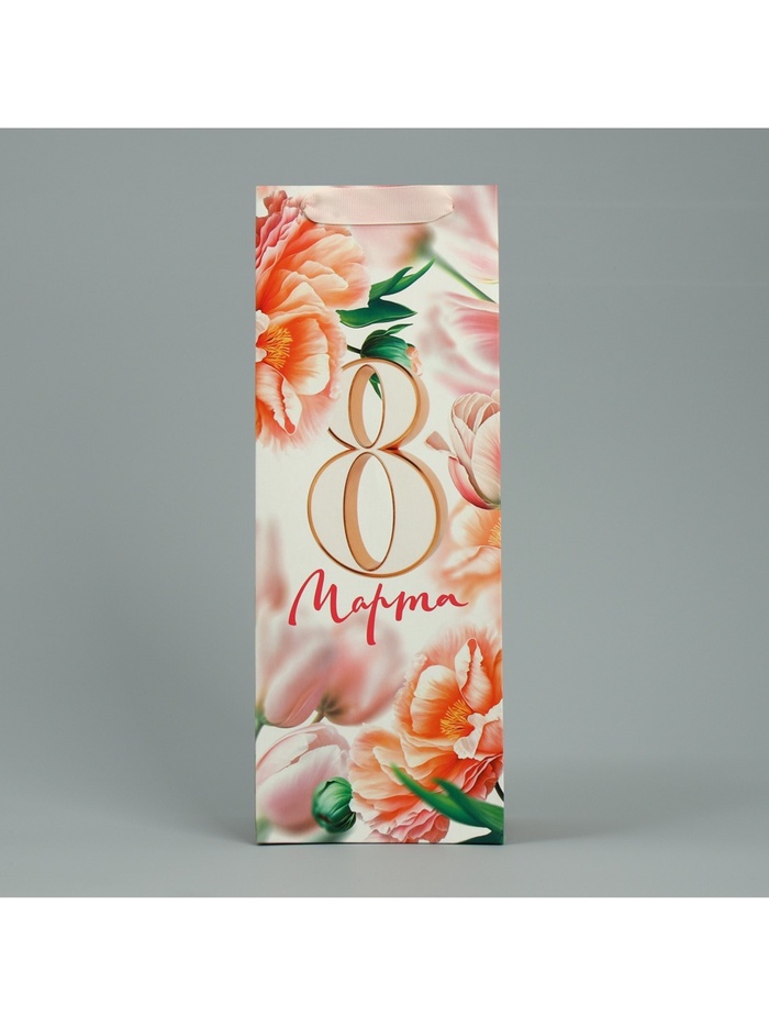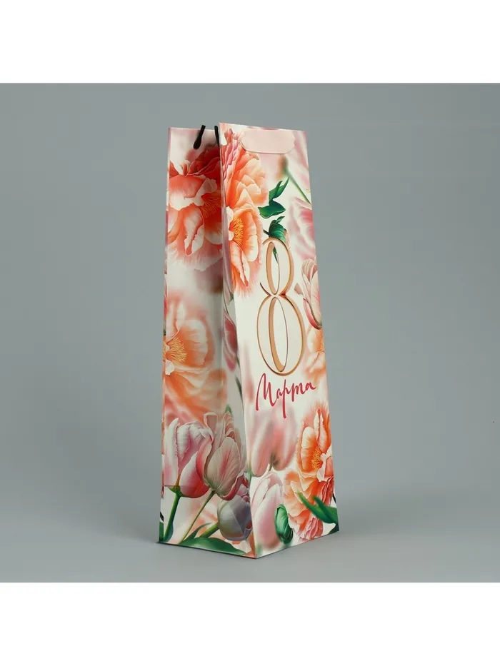 Пакет подарочный ламинированный под бутылку, упаковка, «8 марта», цветы, 13 x 36 x 10 см — Характеристики