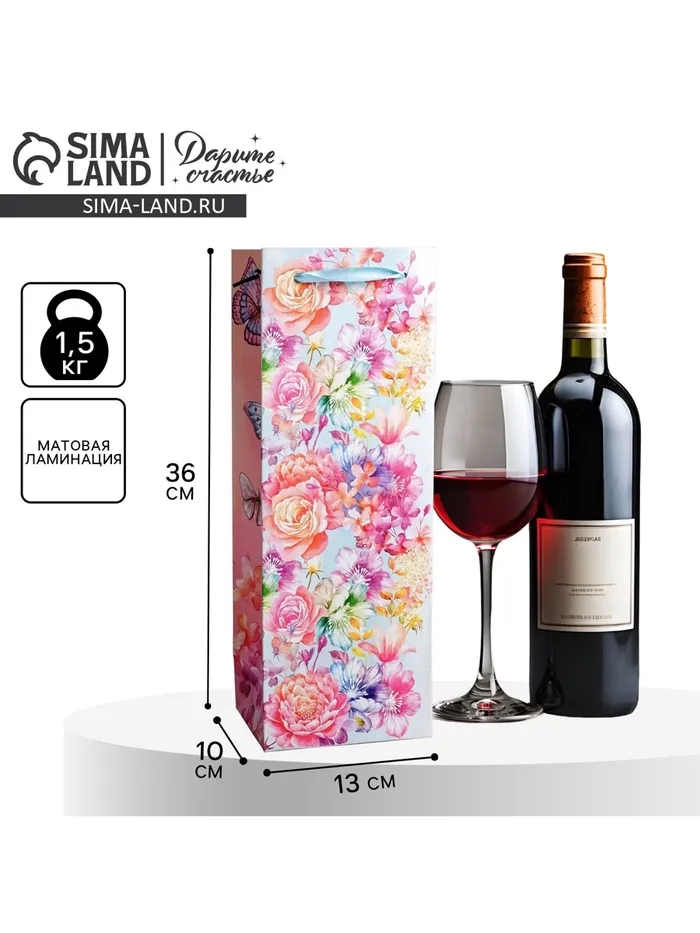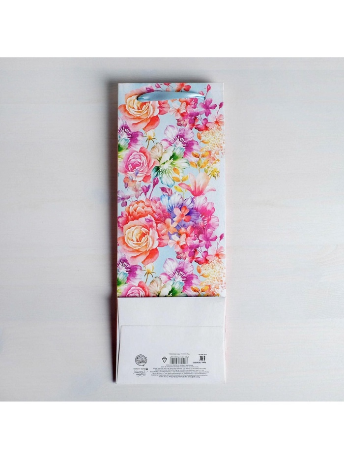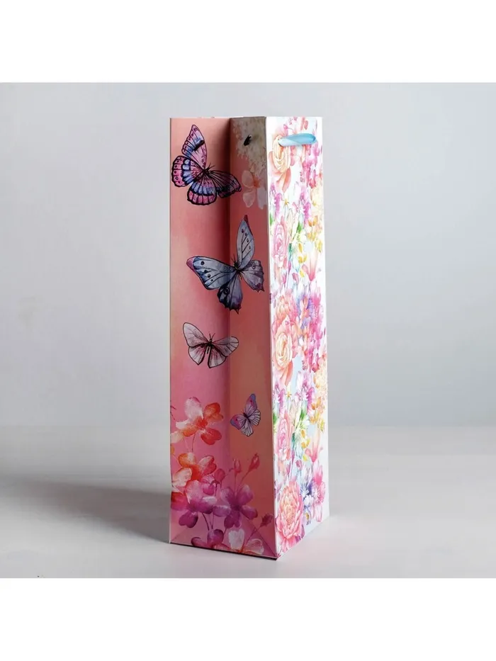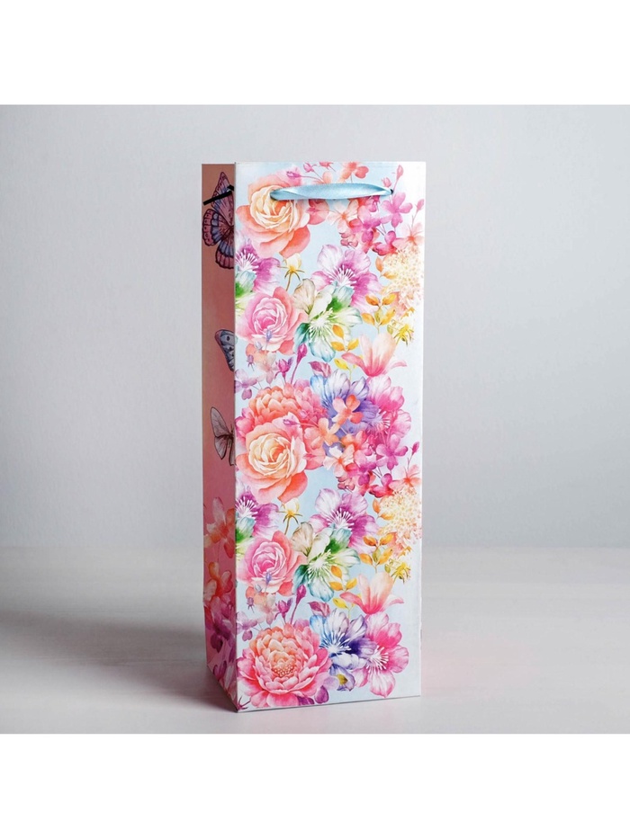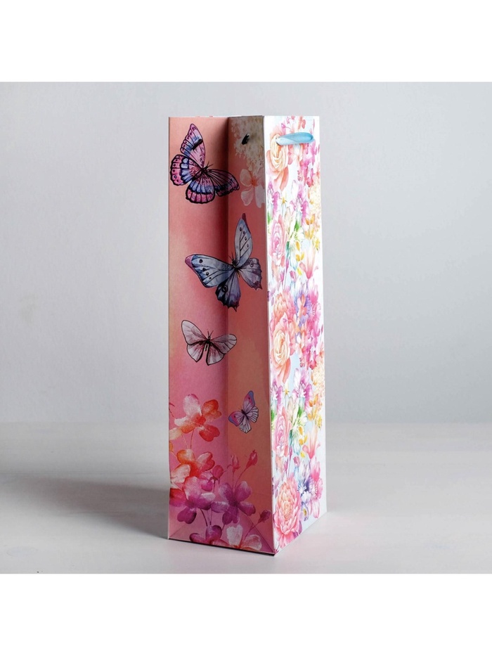 Пакет подарочный ламинированный под бутылку, упаковка, «Цветы и бабочки», 13 х 36 х 10 см — Характеристики
