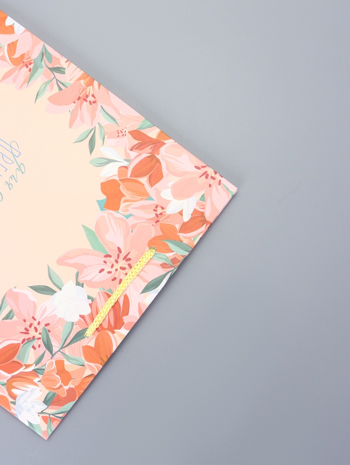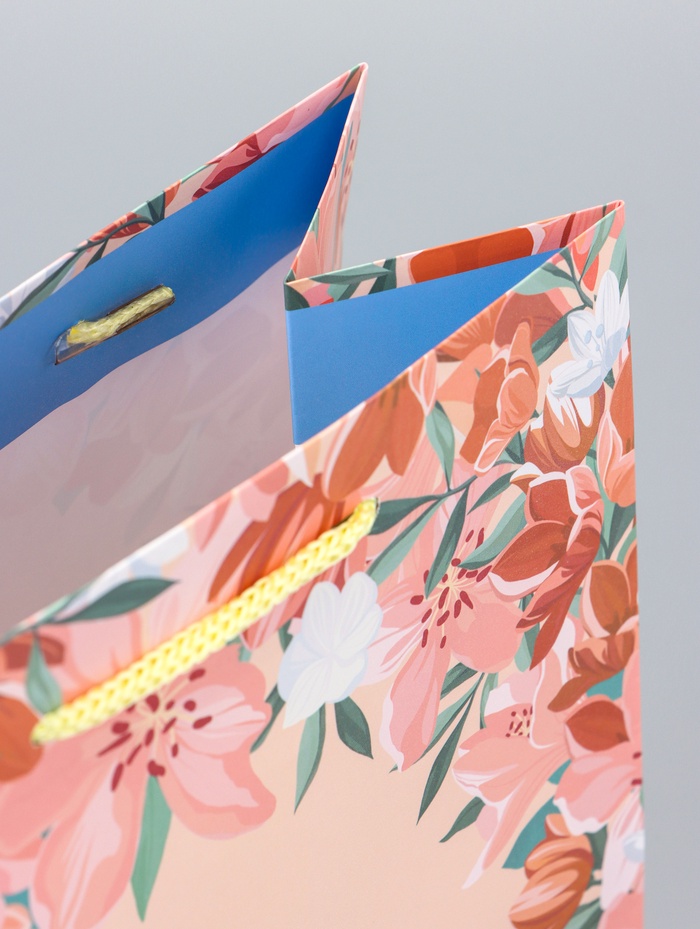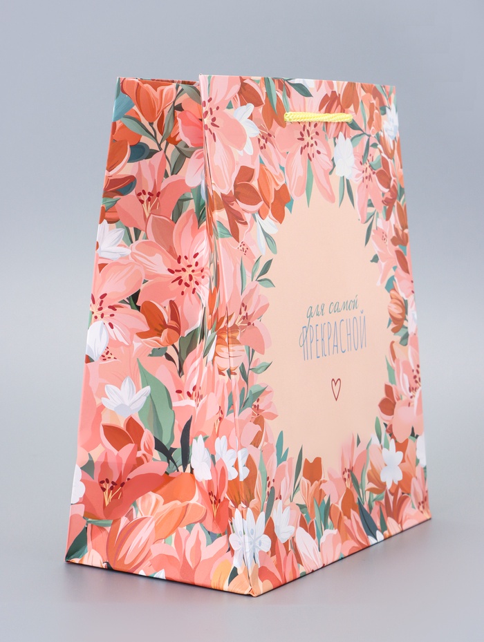 - Нежный цветочный дизайн: Розовый фон с растительными мотивами создает ощущение тепла и нежности. Этот пакет станет гармоничным обрамлением для подарка женщине или девушке.