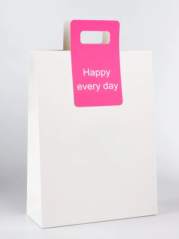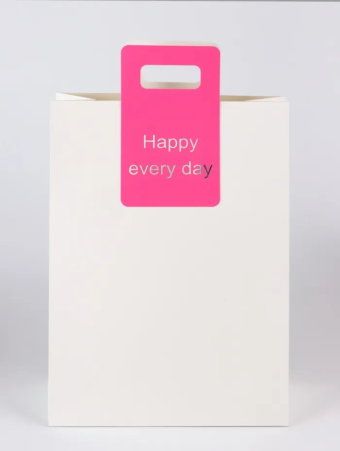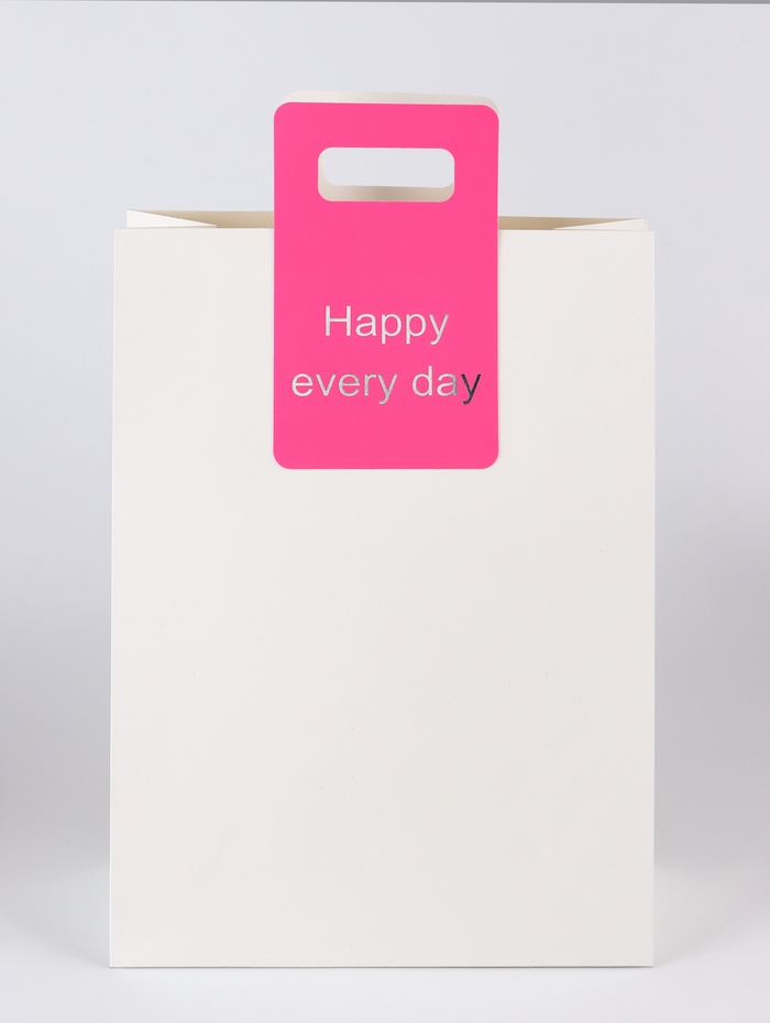 - Надпись "Happy every day" на пакете напоминает о важности ежедневного счастья и позитивного настроя, добавляя эмоциональной ценности вашему подарку. Вырубная ручка обеспечивает удобство при переноске, а также придает пакету стильный и современный вид.