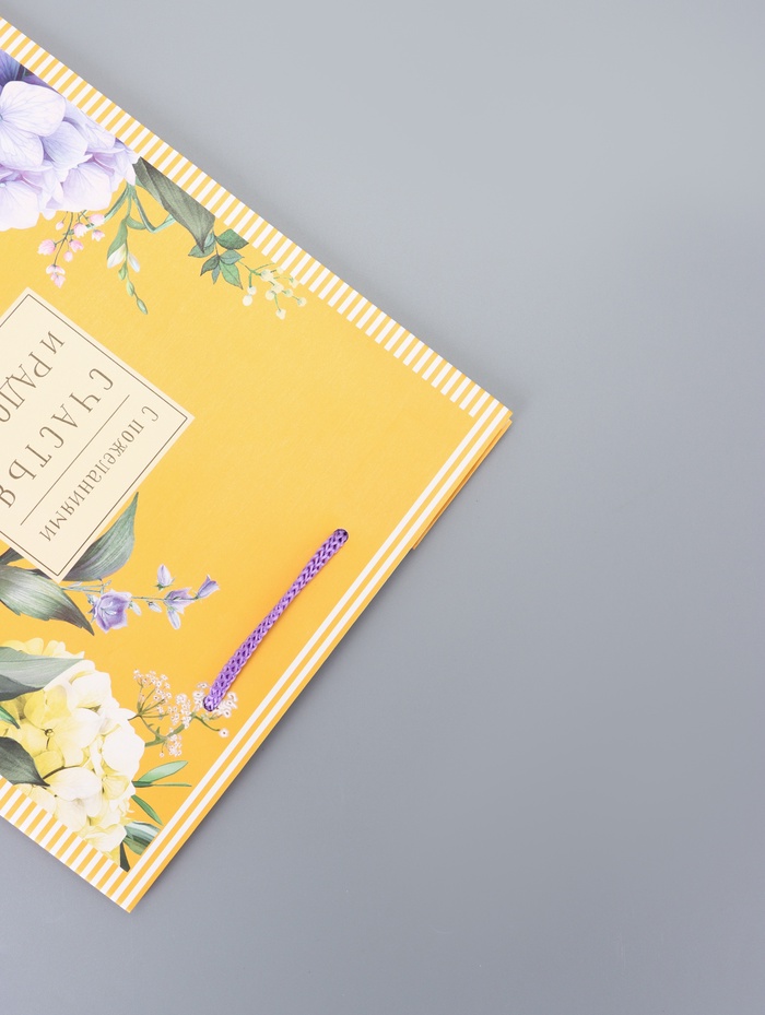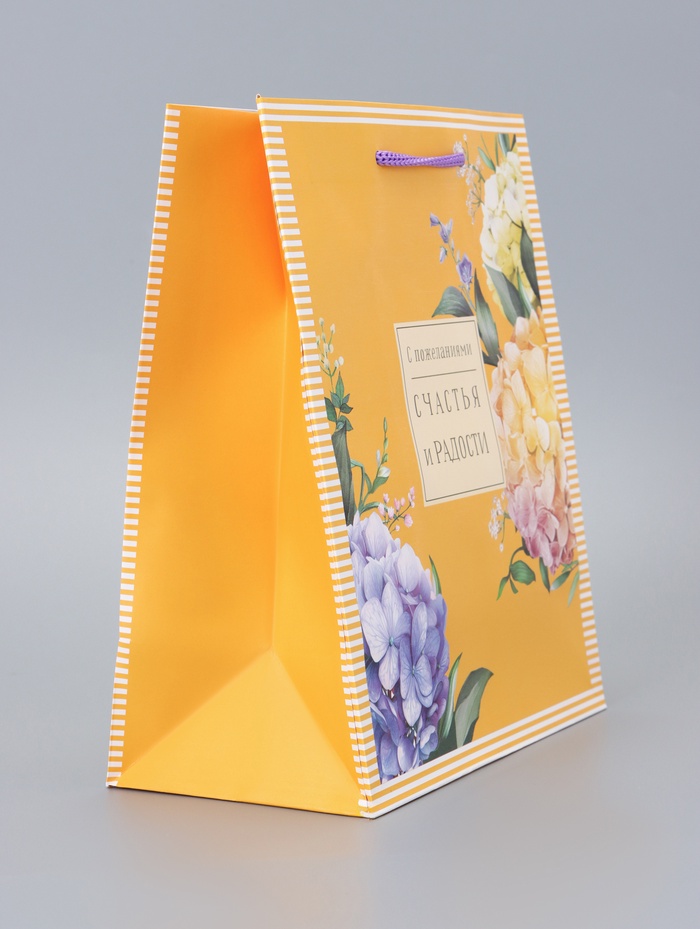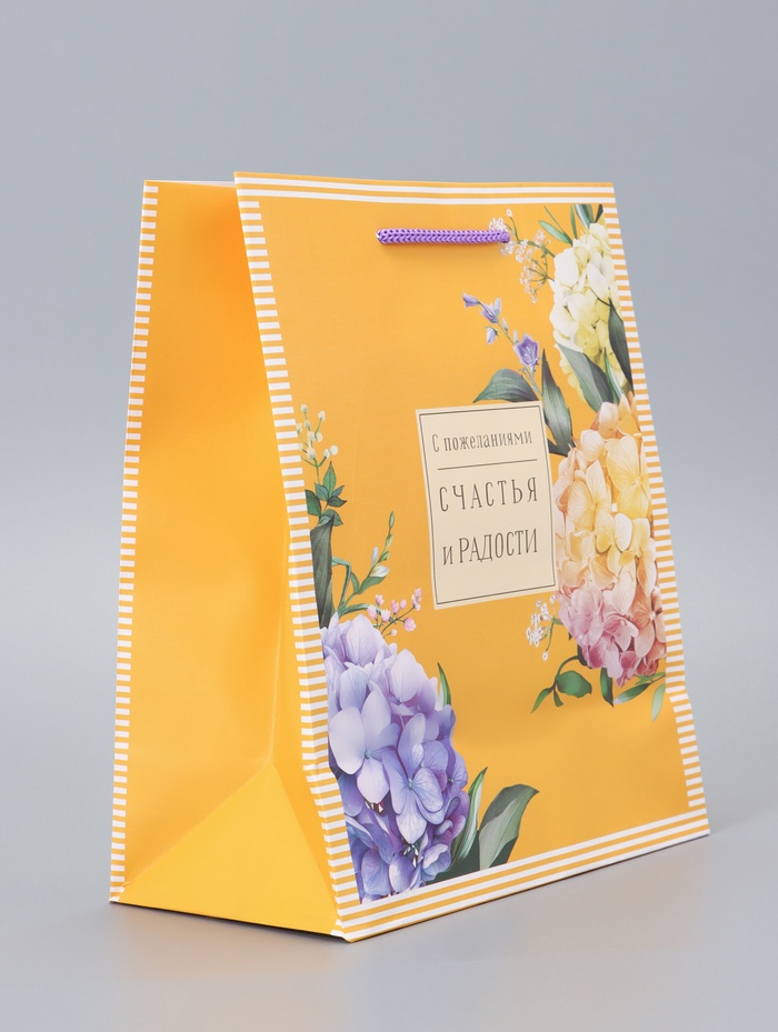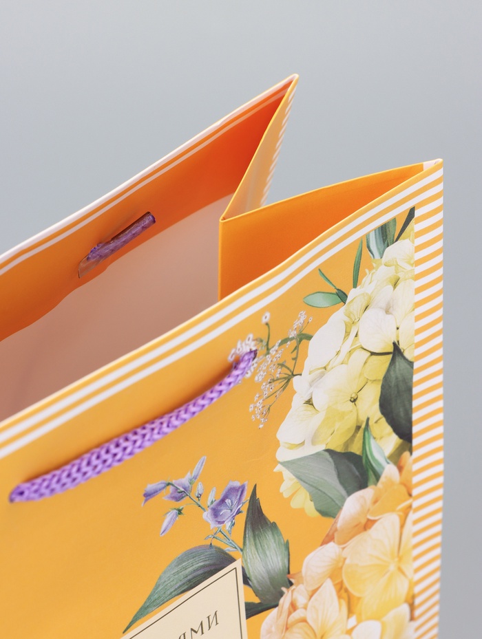- Солнечный дизайн: Желтый фон с цветочными мотивами создает ощущение тепла и оптимизма. Этот пакет станет гармоничным обрамлением для подарка женщине или девушке.