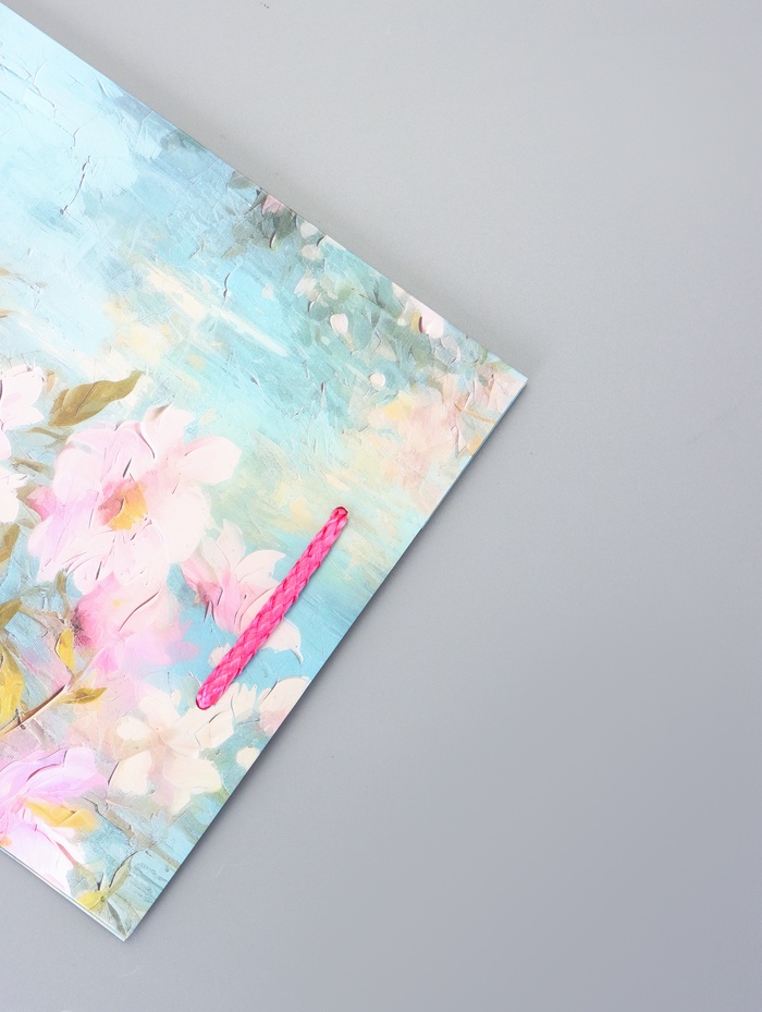 - Продуманная конструкция: Шнуровая ручка удобно лежит в руке, а боковые складки добавляют пакету дополнительный объем. Это решение подходит для упаковки небольших, но ценных подарков.