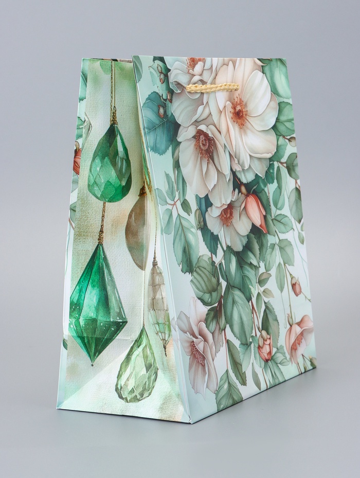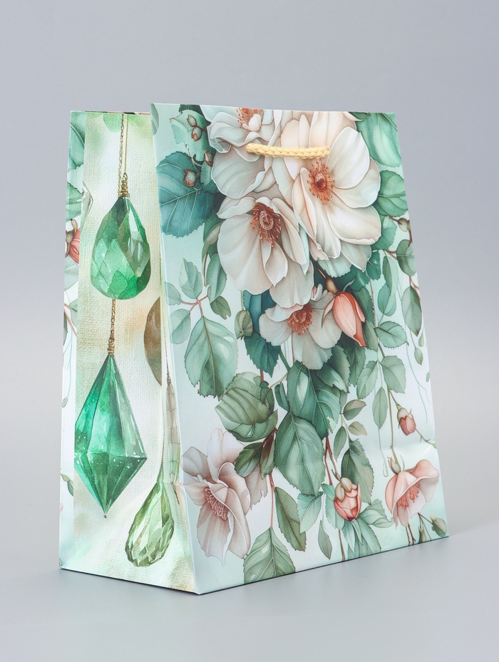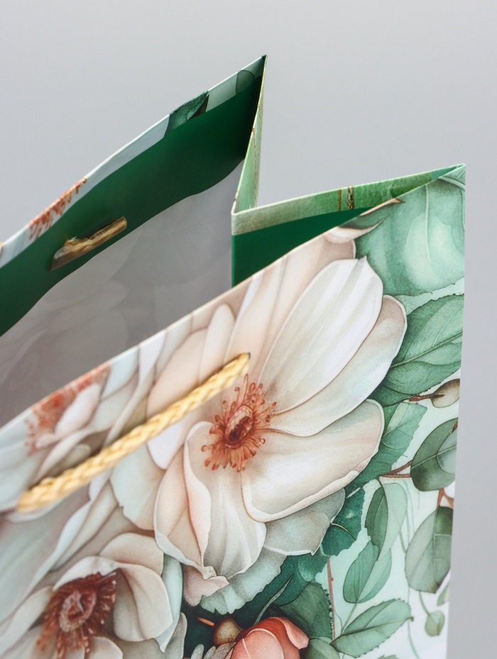 Подарочный пакет «Цветочный рай» — это ламинированная упаковка среднего размера с сочным зеленым фоном и богатым ботаническим принтом. Он создает ощущение природной гармонии и жизненной энергии, делая подарок визуально выразительным.