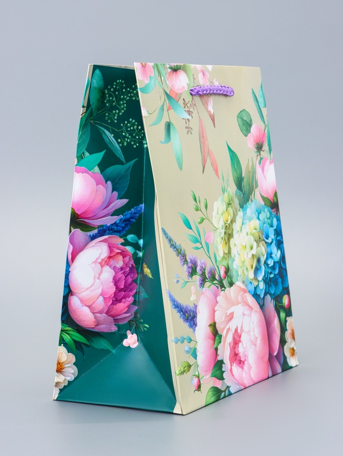 Подарочный пакет «Цветы и Радость» — это ламинированная упаковка среднего размера с сочным зеленым фоном и ярким цветочным рисунком. Он создает ощущение праздника и жизнерадостности, делая момент вручения подарка более эмоциональным.