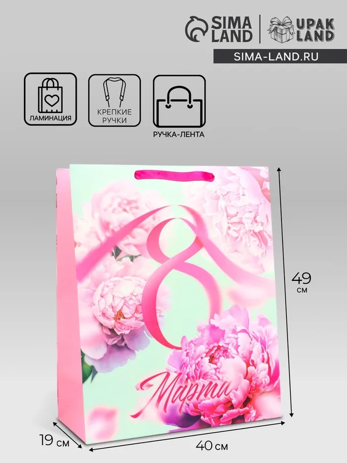 Пакет подарочный ламинированный вертикальный «8 марта», XL 40×49×19 см — Характеристики