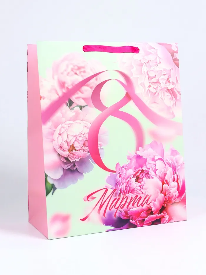 Этот яркий и праздничный подарочный пакет станет идеальным выбором для поздравления девушки на 8 Марта! Вертикальный формат пакета позволяет удобно разместить различные виды подарков, такие как косметика, украшения или книги.