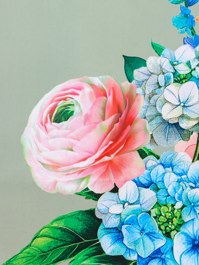 - Сбалансированная цветочная композиция: Дизайн сочетает крупные и мелкие цветы на зелёном фоне, создавая ощущение упорядоченного изобилия. Здесь нет случайных элементов, каждый штрих дополняет общую картину.