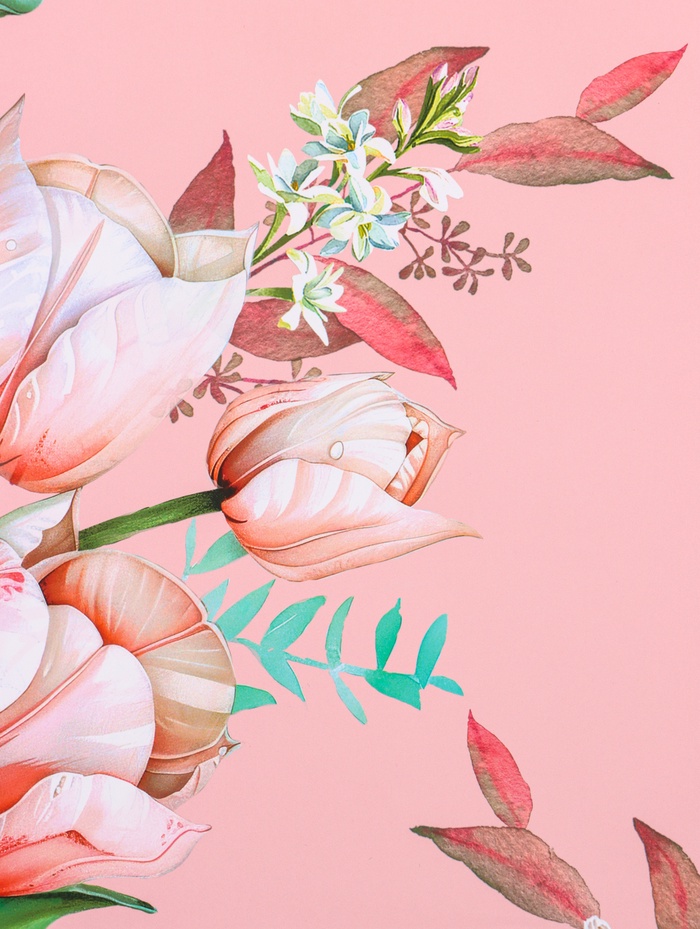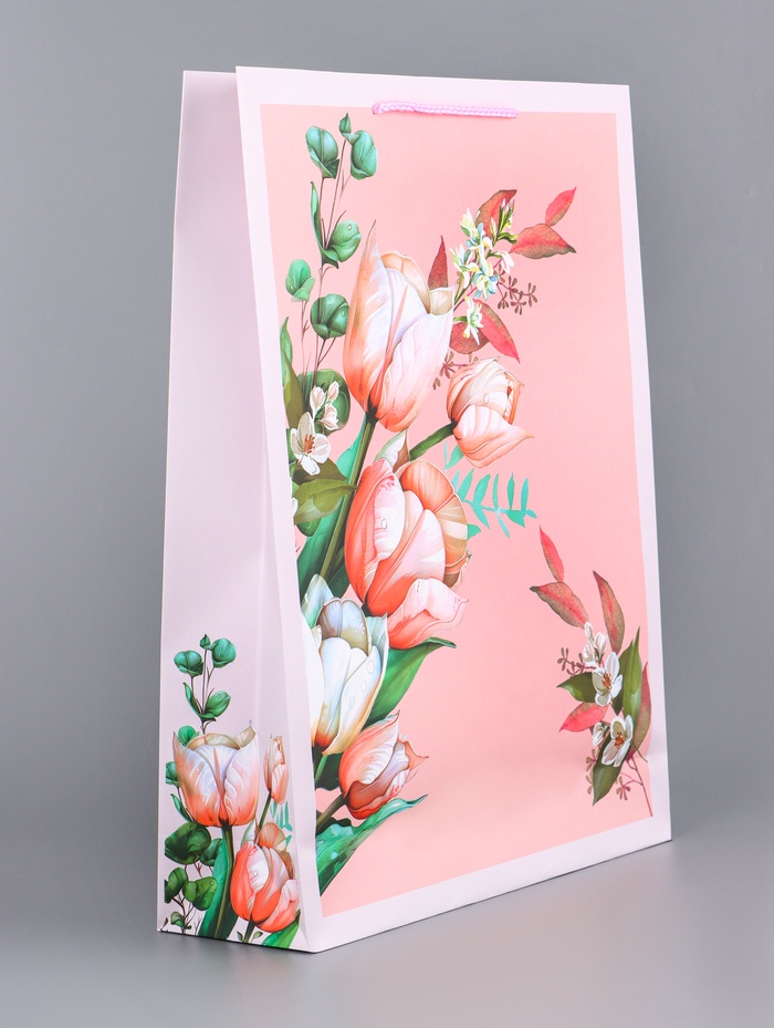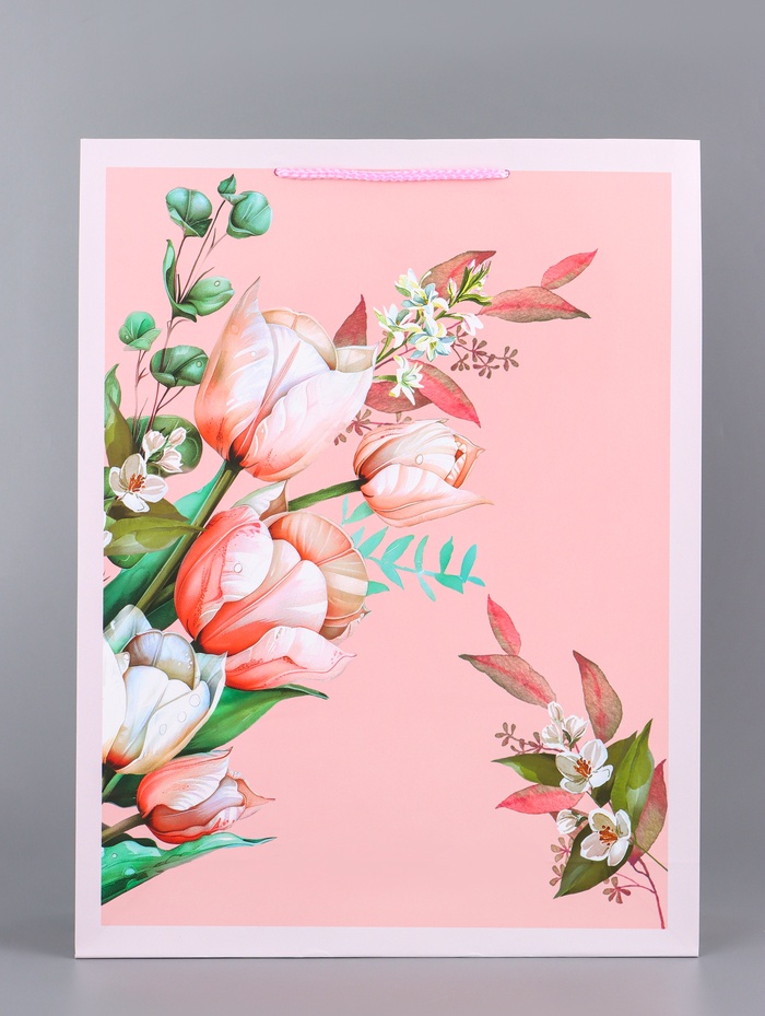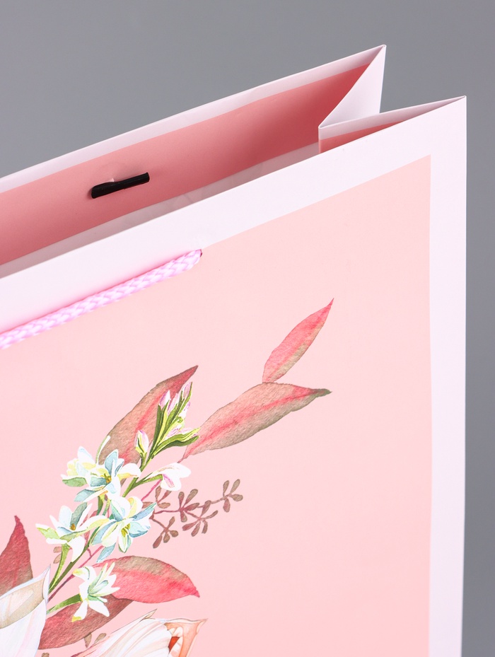 - Плотная ламинированная основа: Качественная бумага с ламинацией держит форму под весом большого подарка и придаёт нежно-розовым оттенкам лёгкий благородный блеск.