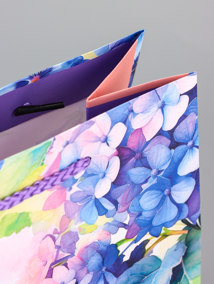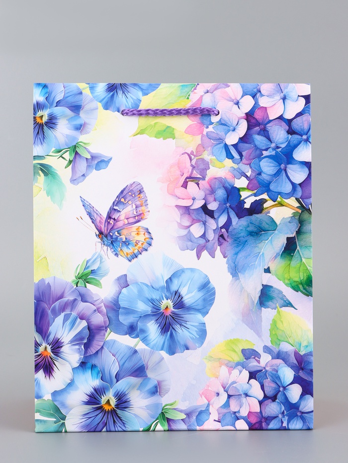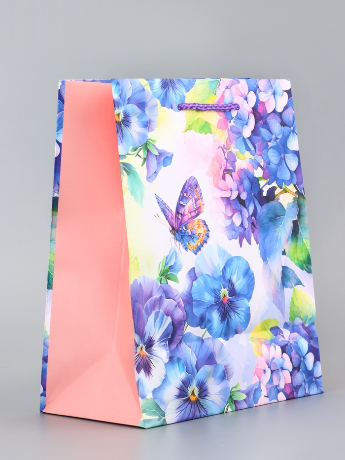 Нежная весенняя палитра. Подарочный пакет с дизайном «Мир фиалок» — это упаковка в пастельных тонах, где цветы и бабочки создают ощущение лёгкости и свежести. Дизайн навевает мысли о саде.