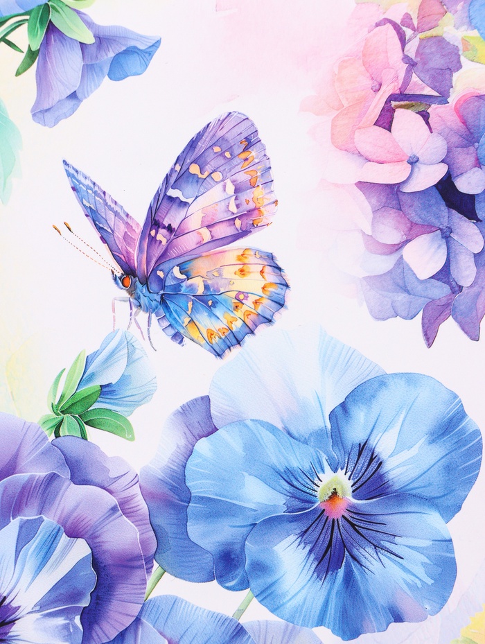 - Нежный сюжет с фиалками и бабочками: Голубой фон, белые цветы и порхающие бабочки образуют целостную, воздушную композицию. Такой рисунок выбирают для подарков с особым вниманием к деталям.