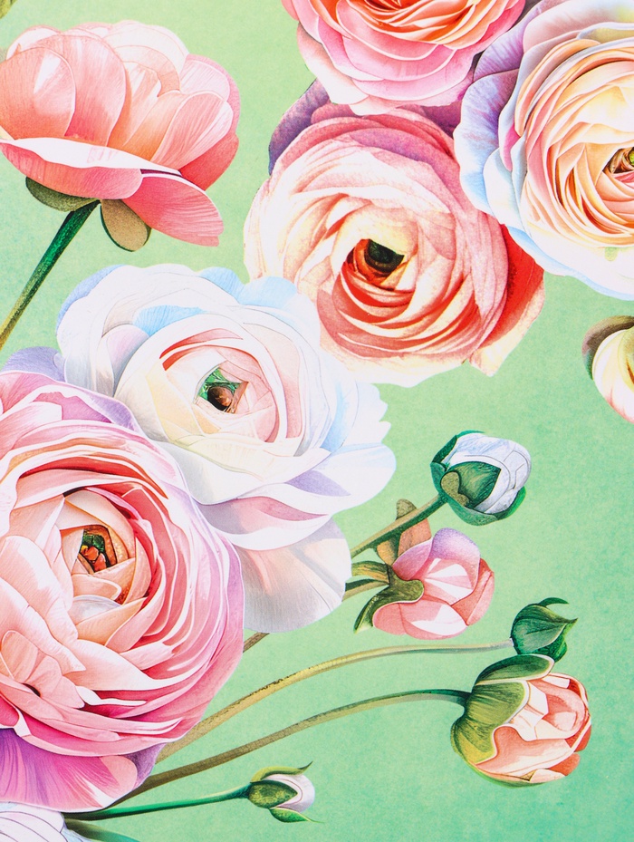 - Богатая цветочная композиция: Дизайн сочетает розы, пионы и мелкие соцветия на зелёном фоне, имитирующем листву. Такой узор создаёт эффект изобилия и щедрости.