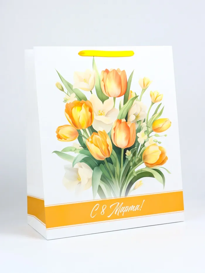 Этот яркий и праздничный подарочный пакет станет идеальным выбором для поздравления девушки на 8 Марта! Вертикальный формат пакета позволяет удобно разместить различные виды подарков, такие как косметика, украшения или книги.