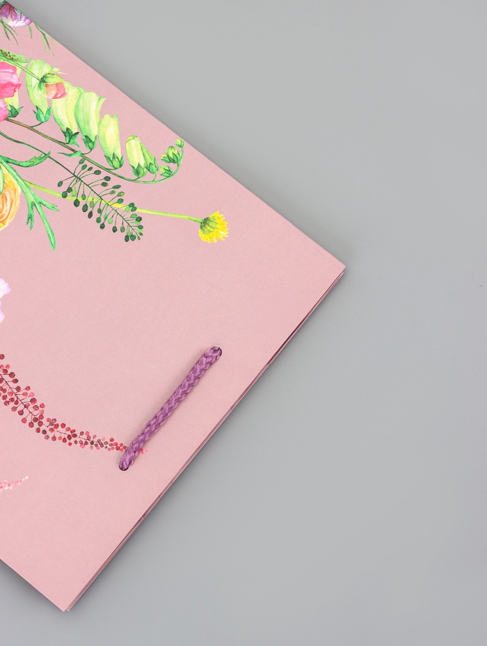 - Шнуровая ручка для комфорта: Ручка из шнура удобнее и надёжнее бумажной. Она дополняет образ качественной, готовой к использованию упаковки.