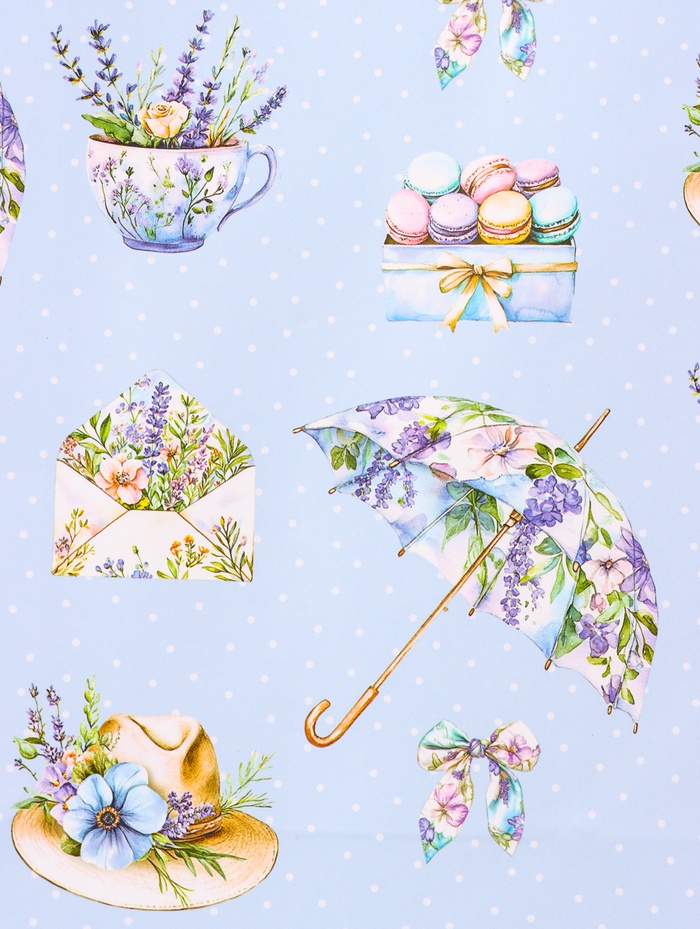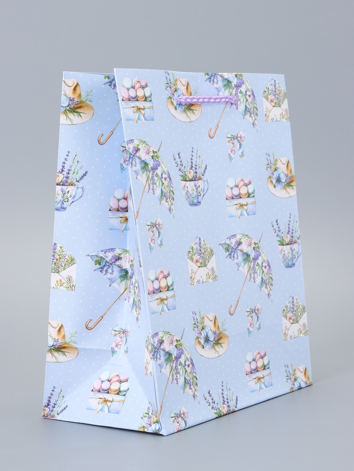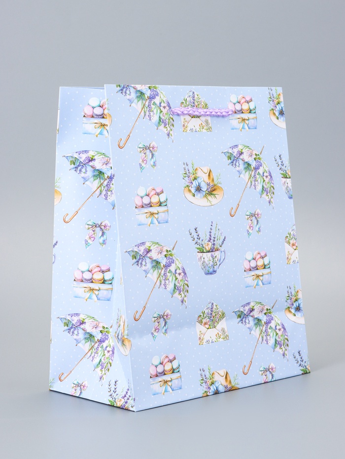 Подарочный пакет «Зонтик» — это ламинированная упаковка среднего размера с нежным голубым фоном и романтичным рисунком. Изящный принт создает ощущение легкости и заботы, делая презент визуально привлекательным.