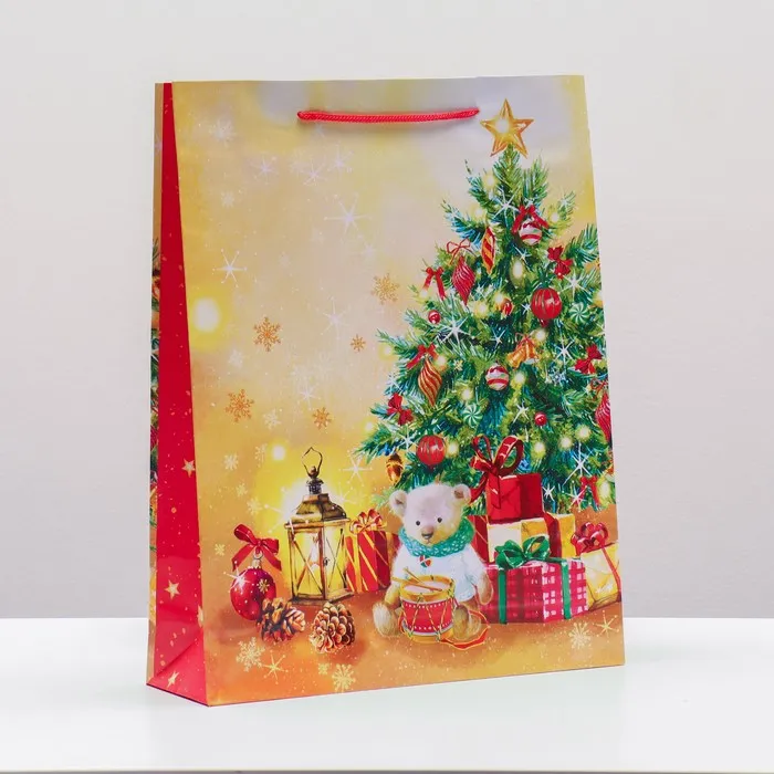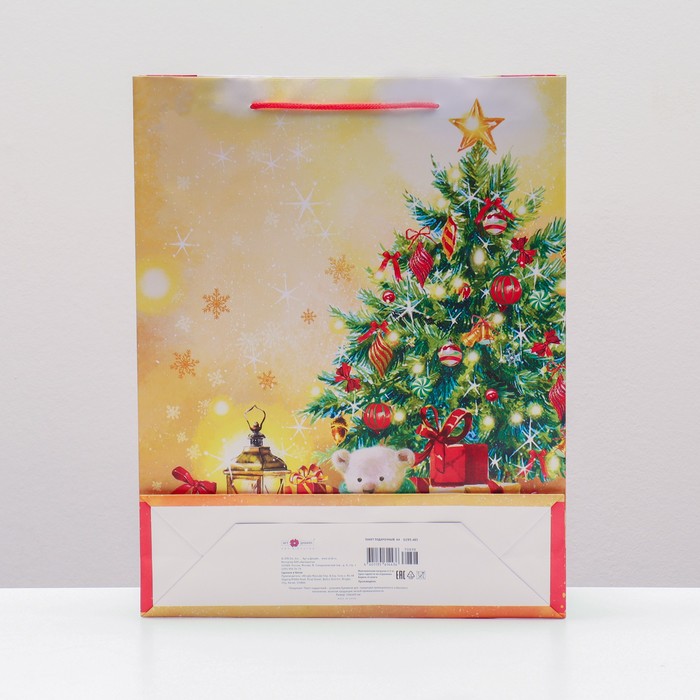 Новогодний подарочный пакет с ярким, красочным рисунком создаст праздничное настроение.