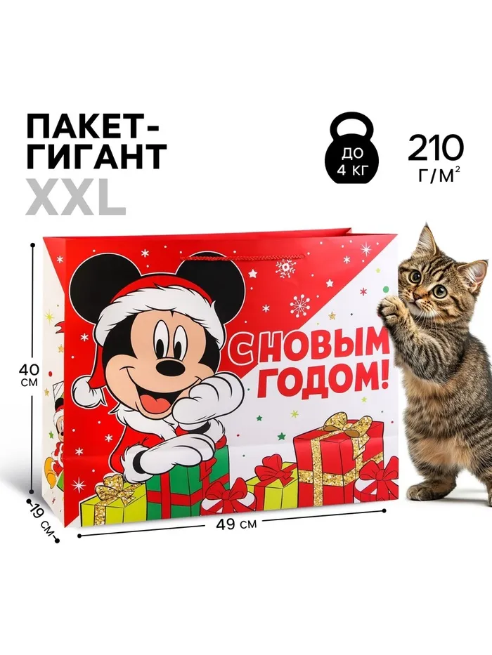 Пакет подарочный новогодний, 40х49х19 см, упаковка, Микки Маус — Характеристики