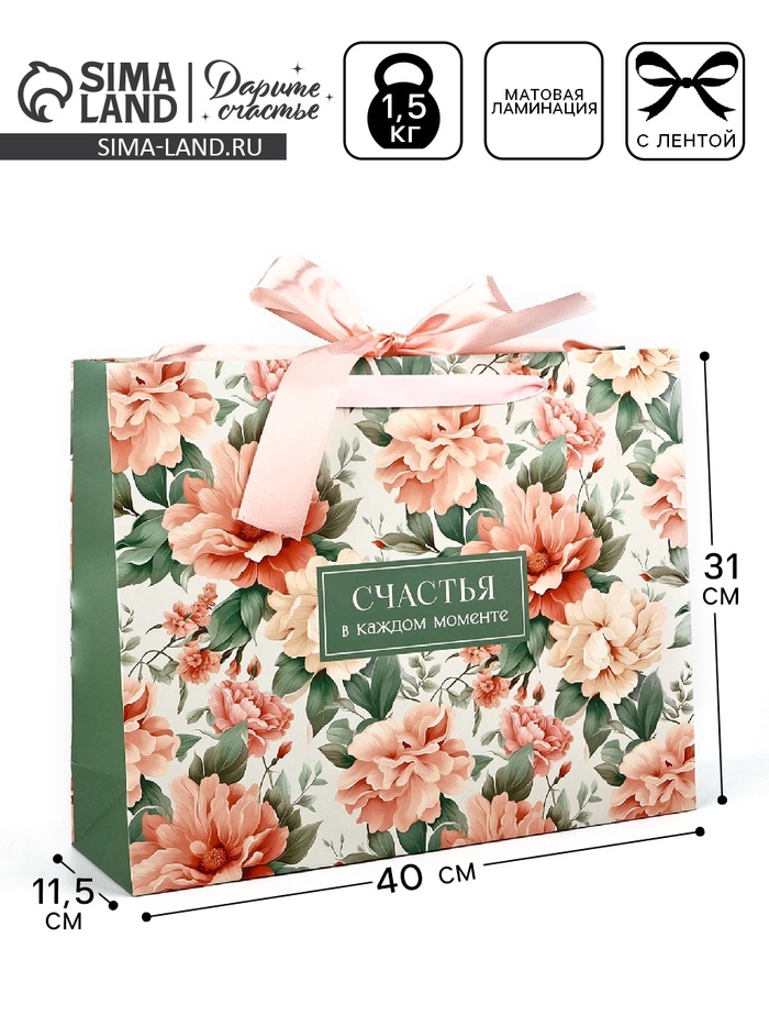 Пакет ламинированный с лентой «Счастья», цветы, L 40 х 11.5 х 31 см