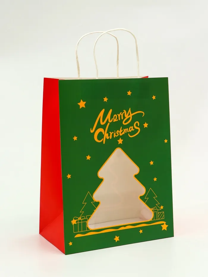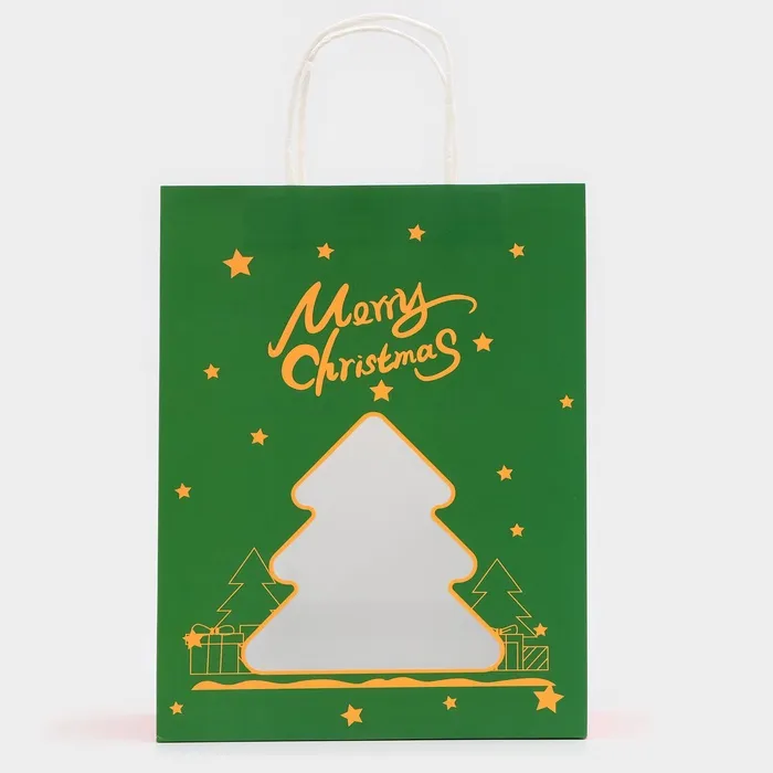 Пакет подарочный новогодний крафт, с окном «Ёлка» 26×35×16 см — Характеристики