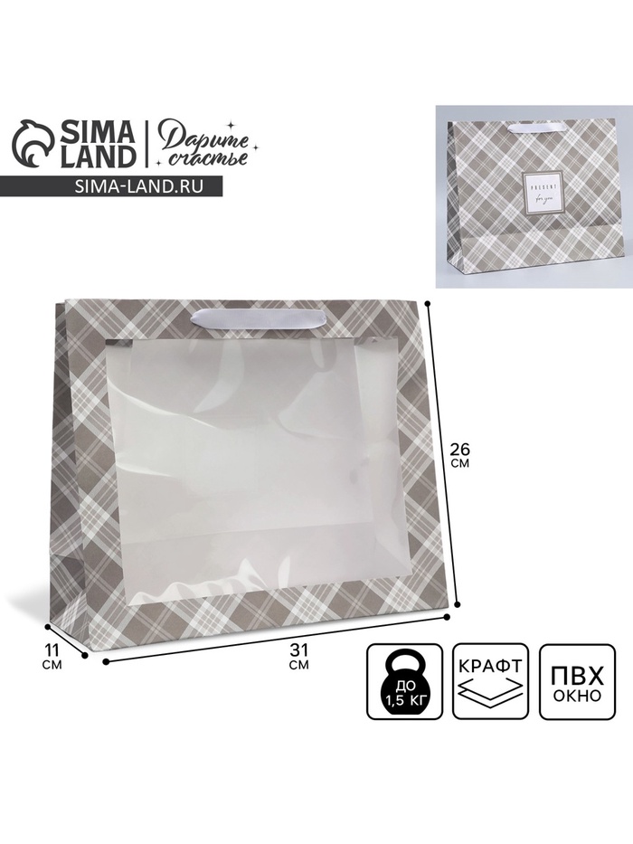 - Размеры пакета делают его универсальным для упаковки подарков среднего размера, а удобные ручки обеспечивают комфортную переноску. Внутреннее пространство пакета достаточно вместительное, чтобы разместить в нем даже объемные предметы, при этом окно сохраняет элегантный внешний вид упаковки.