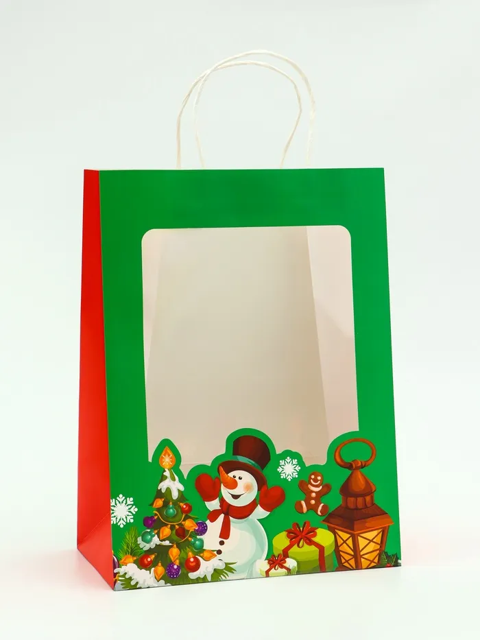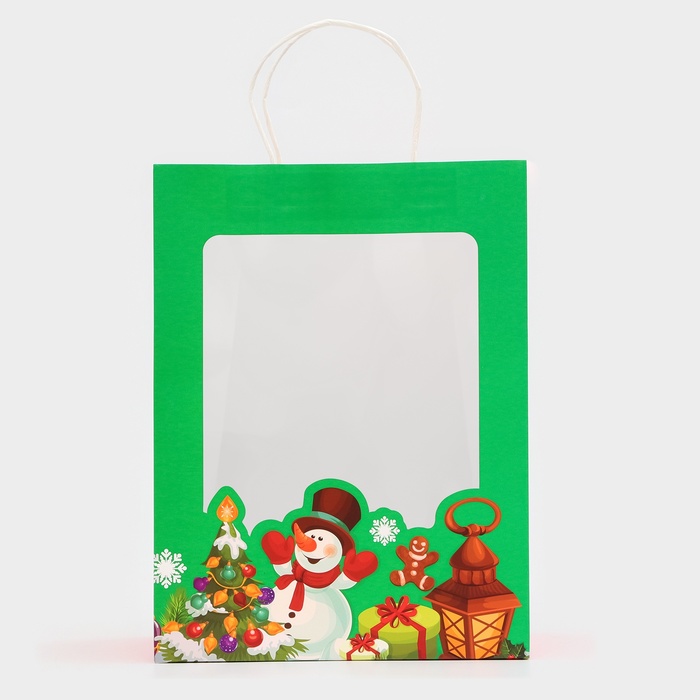 Пакет подарочный новогодний крафт, с окном «Снеговик» 26×35×16 см — Характеристики