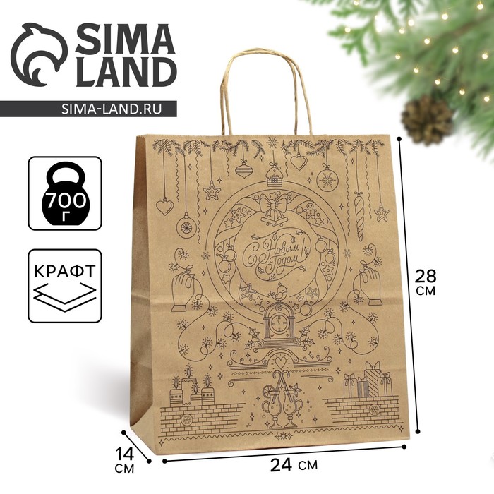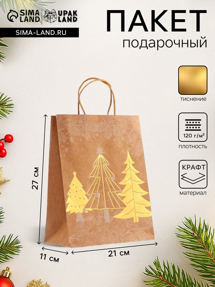 Пакет подарочный новогодний, крафт с зол. тиснением, круглая ручка,«Рождественский лес» 21×27×11 см, 120 г — Характеристики
