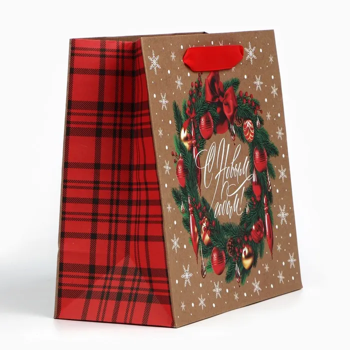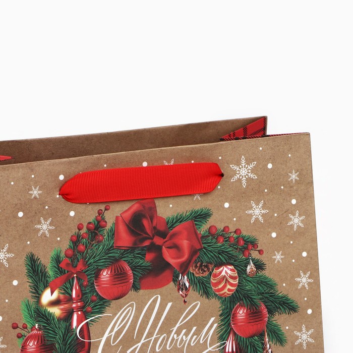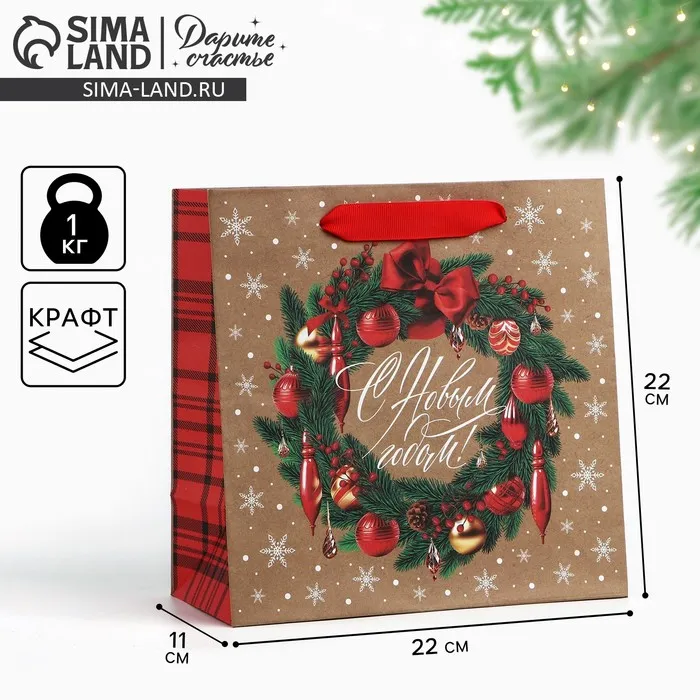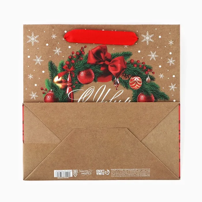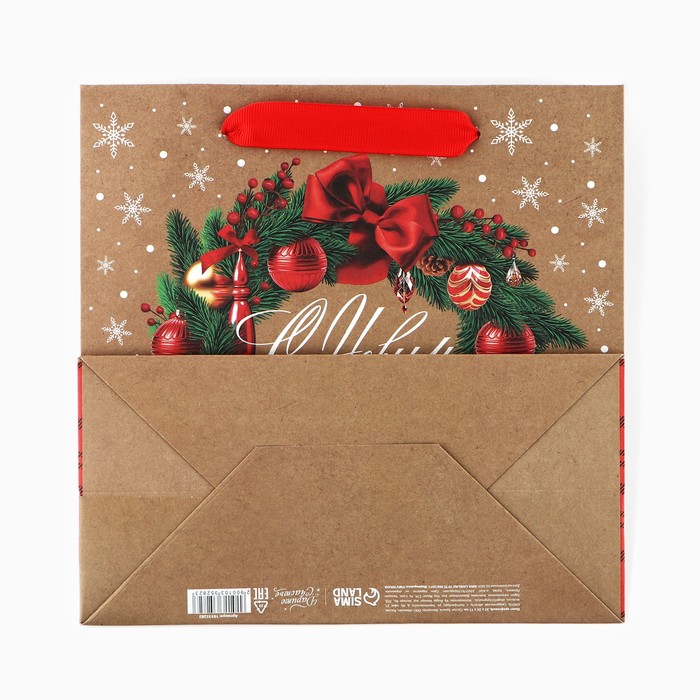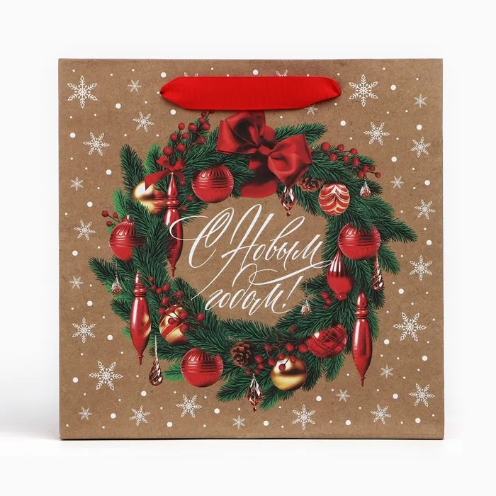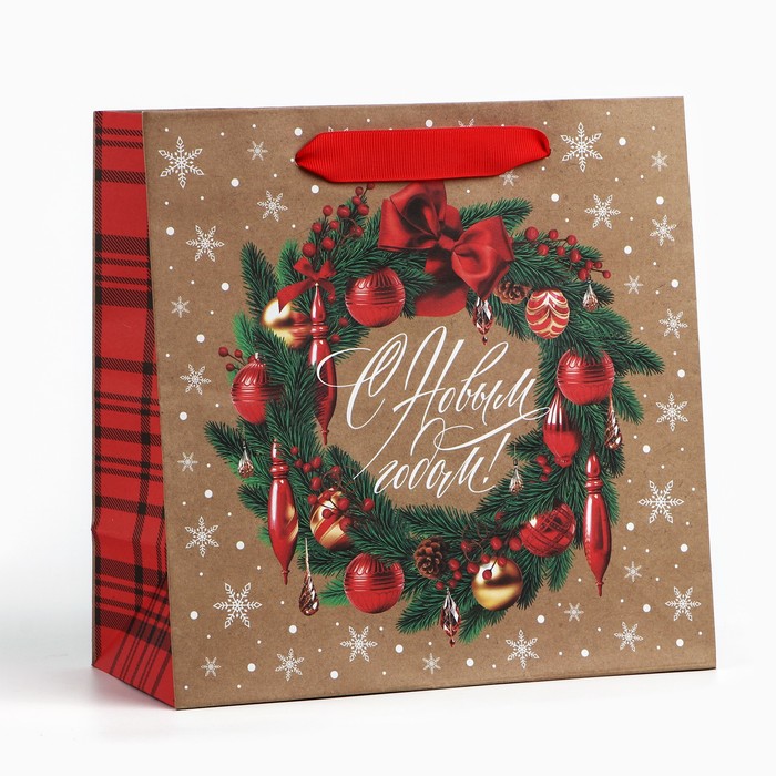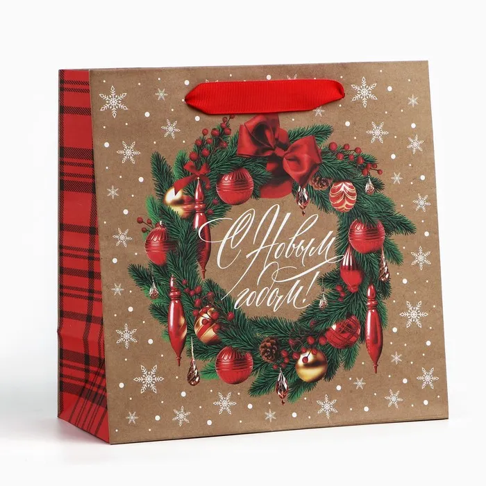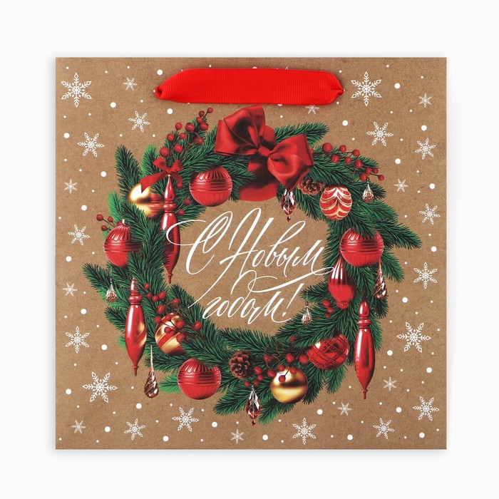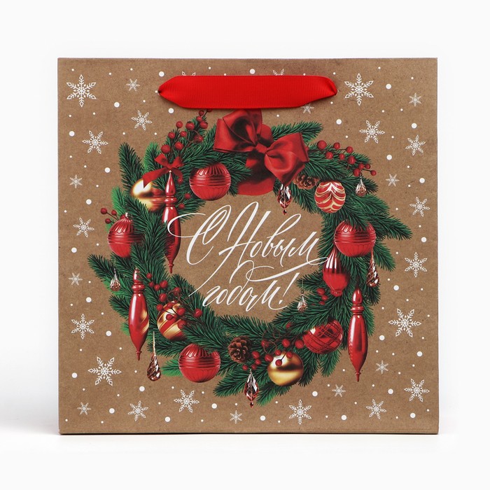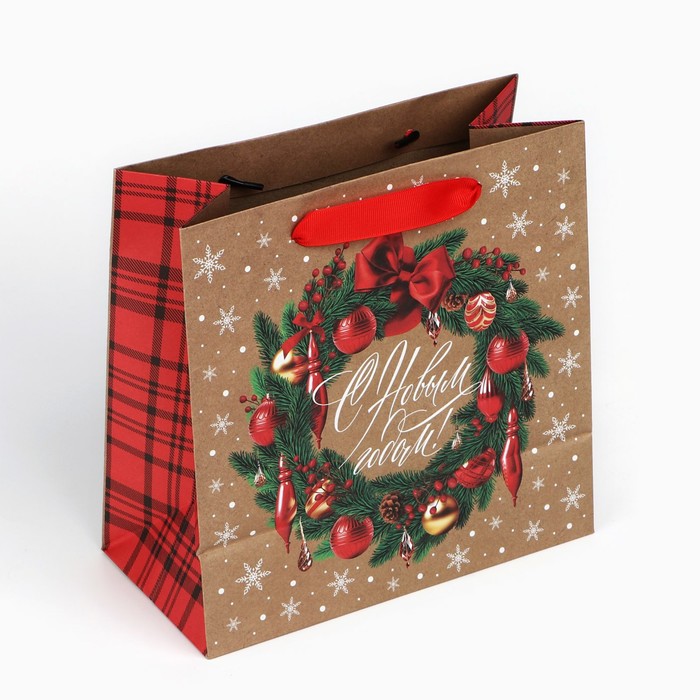 Пакет подарочный новогодний крафтовый квадратный «Новогодний венок», 22 х 22 х 11 см — Характеристики