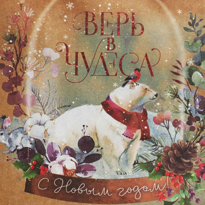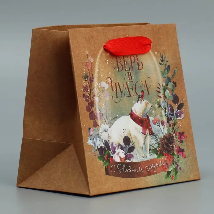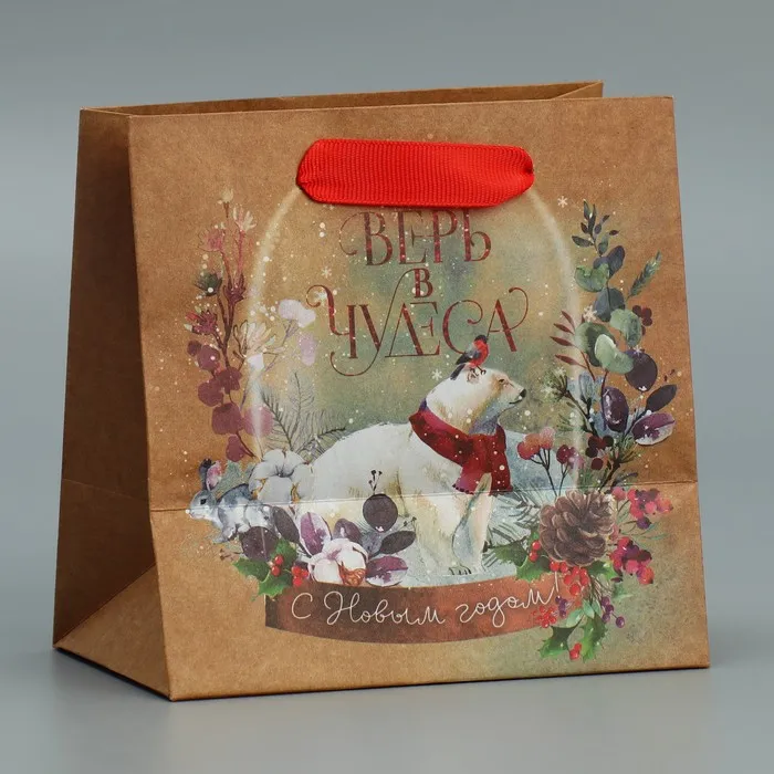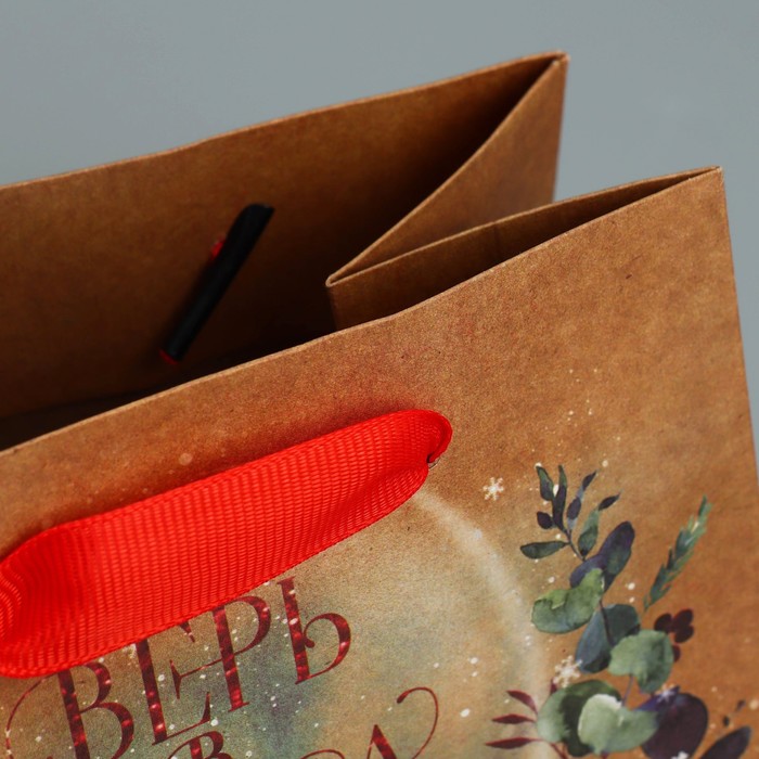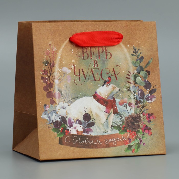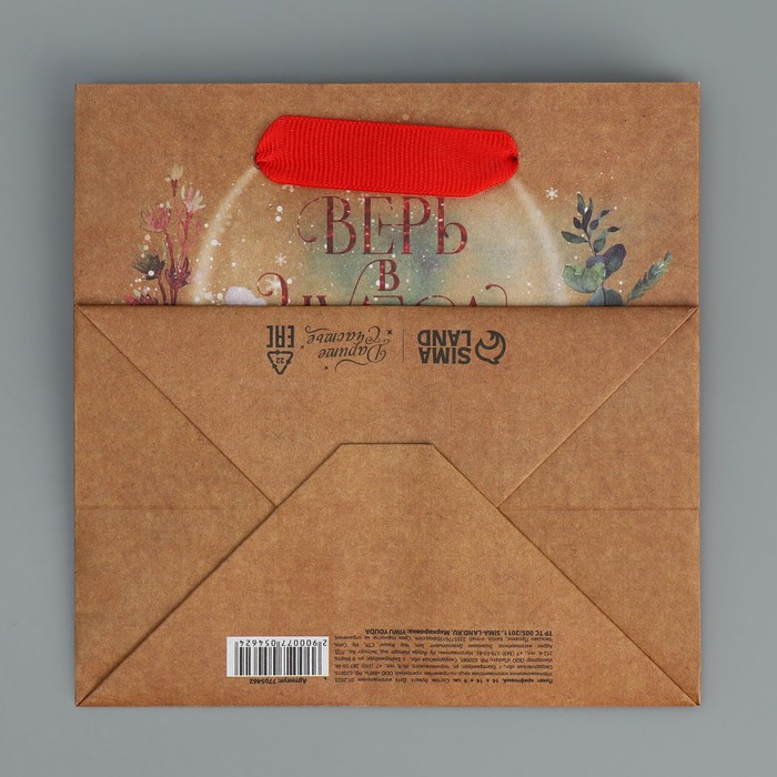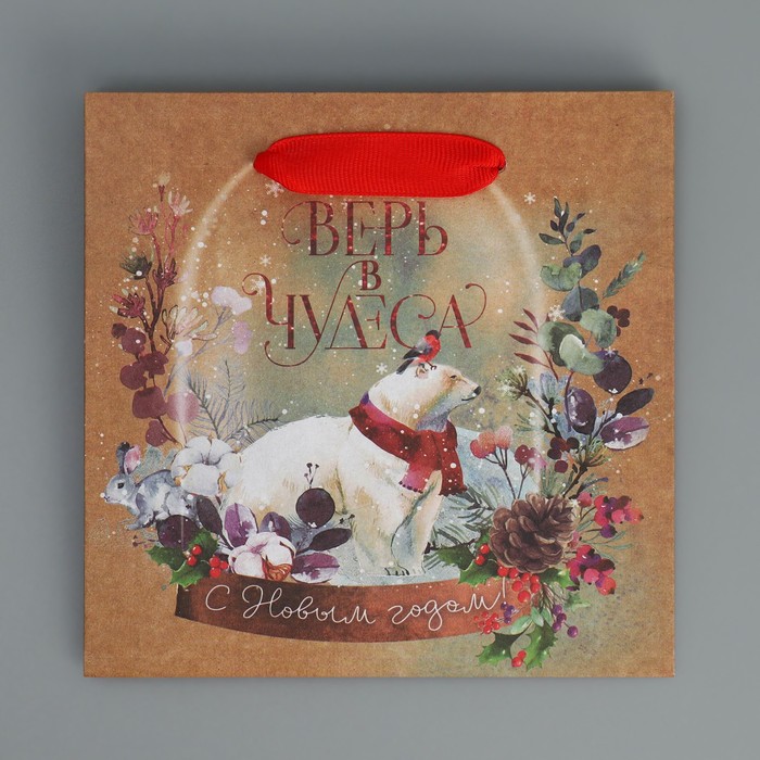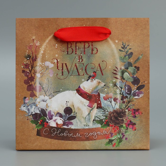 Пакет подарочный новогодний крафтовый квадратный «Верь в чудеса», 14 х 14 х 9 см — Характеристики