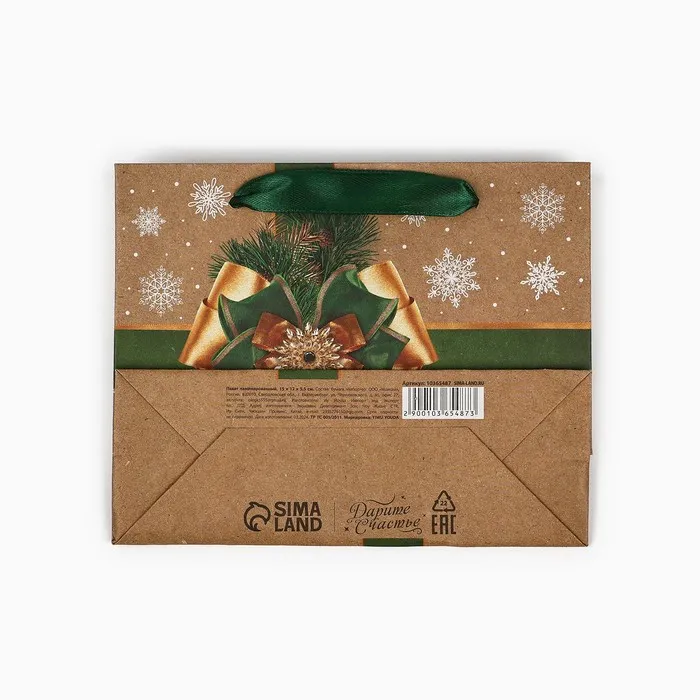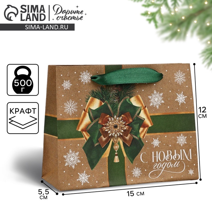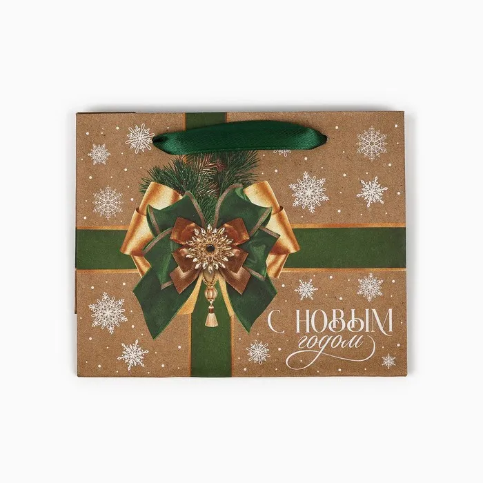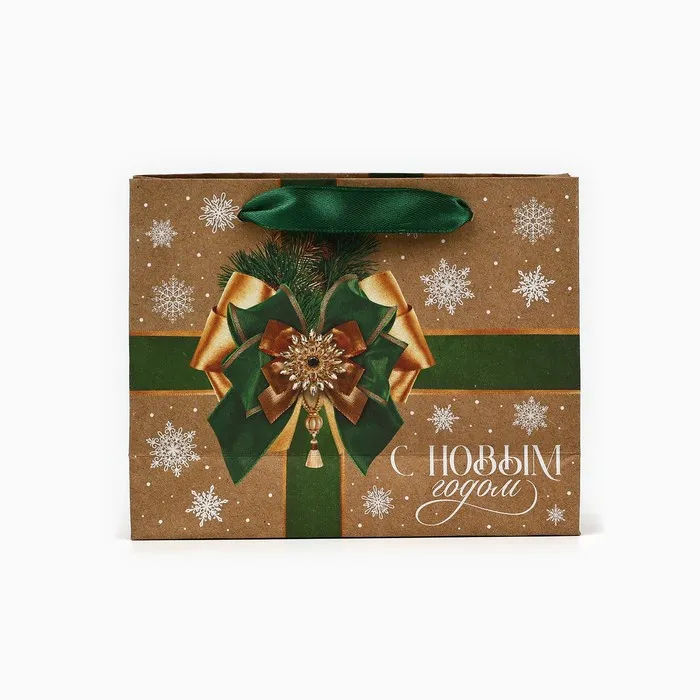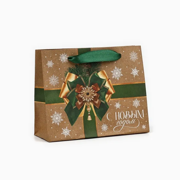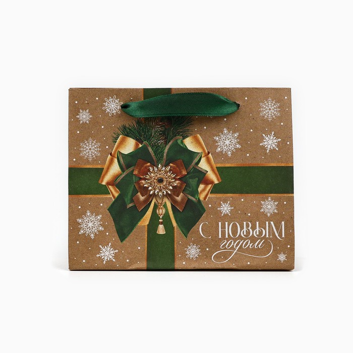Пакет подарочный новогодний крафтовый «Новогодний бант», S 15 х 12 х 5.5 см — Характеристики