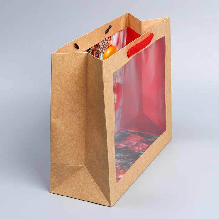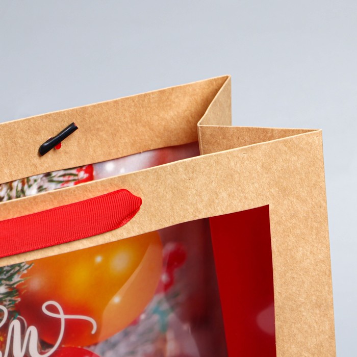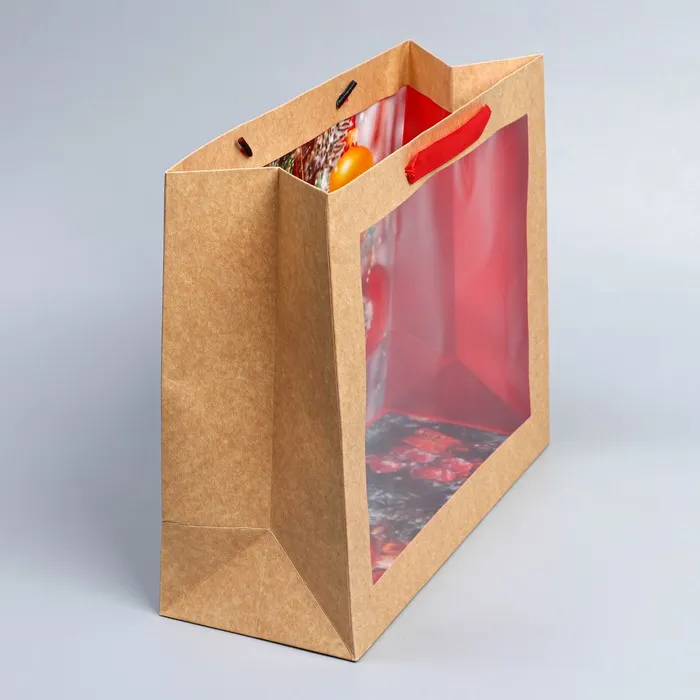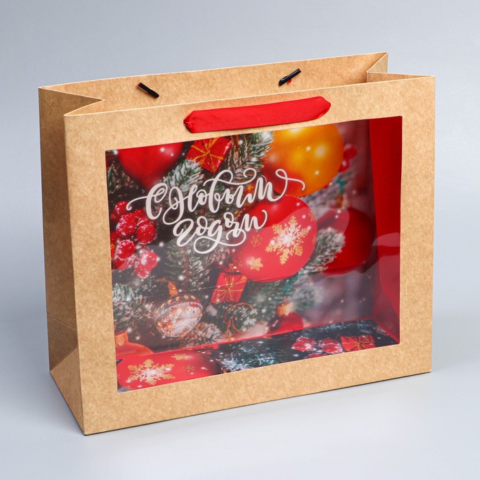 Пакет подарочный новогодний крафтовый с пластиковым окном «Happiness», 31 х 26 х 11 см — Характеристики