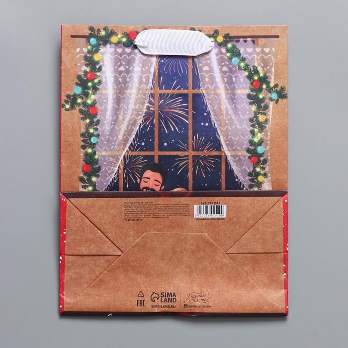 Пакет бумажный подарочный новогодний крафт «Счастливого нового года» 26×32×12 см