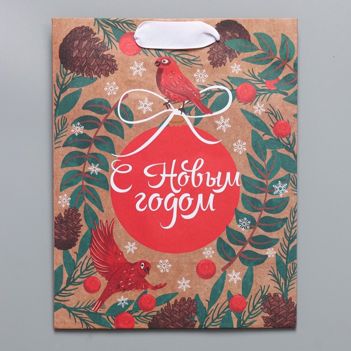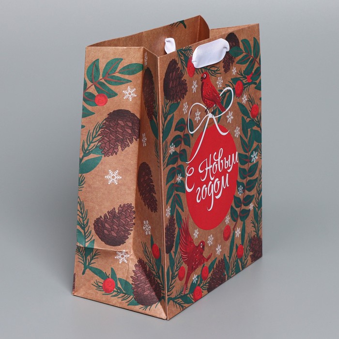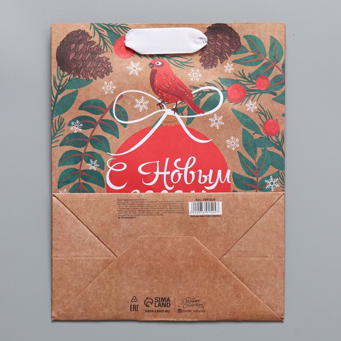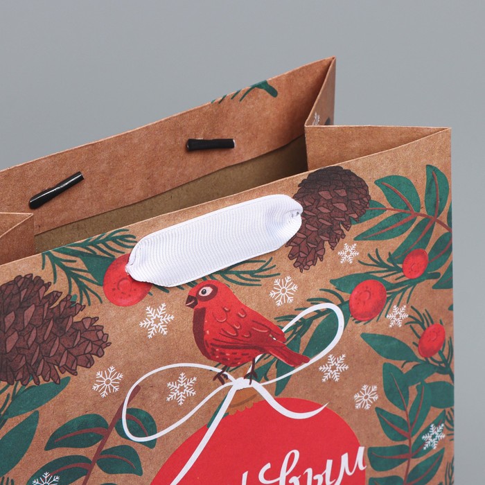Пакет бумажный подарочный новогодний крафт «Новогодний бант» 18×8×25 см