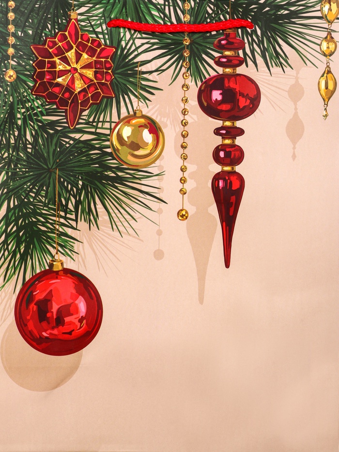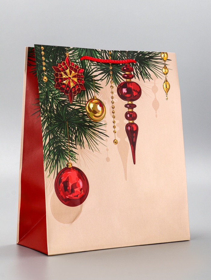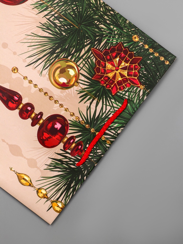 • Классический дизайн: Теплый бежевый фон с изображением новогодних шаров создает атмосферу традиционного праздника. Универсальное оформление подходит для подарков всем членам семьи.