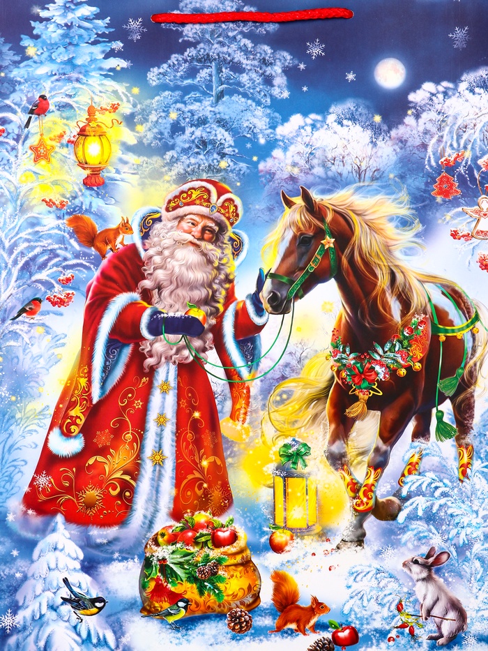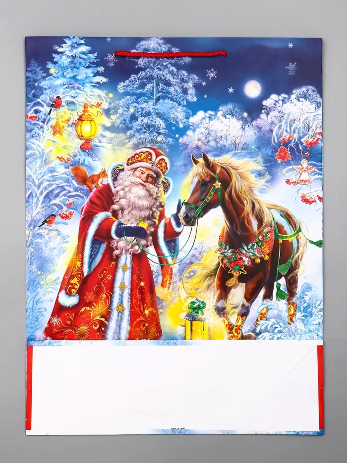 Идеальный выбор для семейных подарков: Этот пакет особенно подходит для презентов, которые дарят от всей семьи или близким родственникам. Образ Деда Мороза с конём напоминает о детских праздниках, семейных традициях и самом ожидаемом моменте новогодней ночи. «Дед Мороз и Конь» — это упаковка, которая сама по себе становится частью праздничной традиции.
