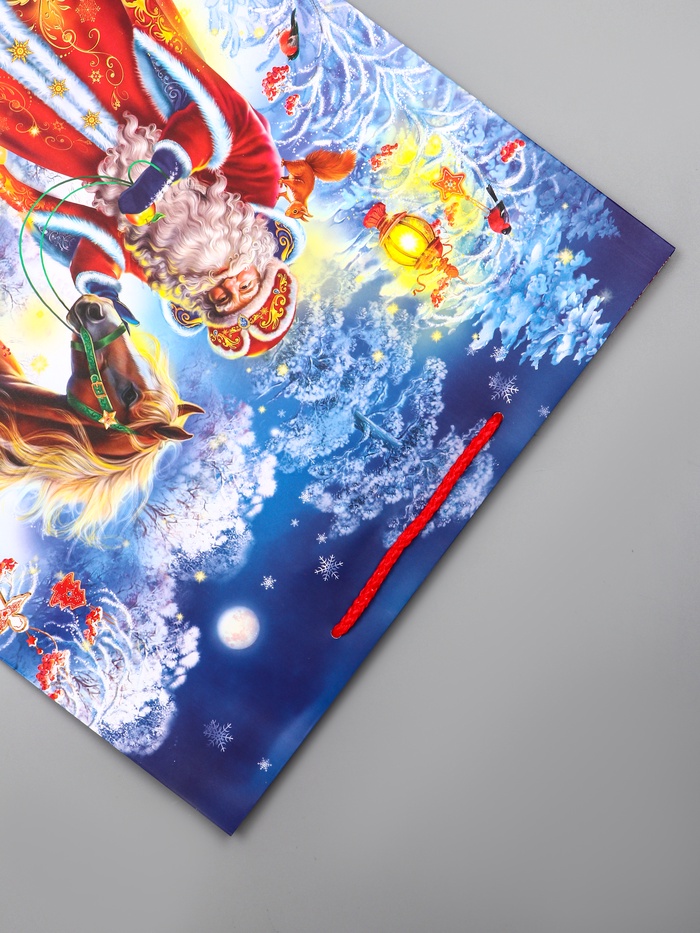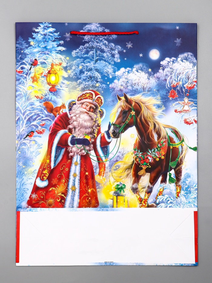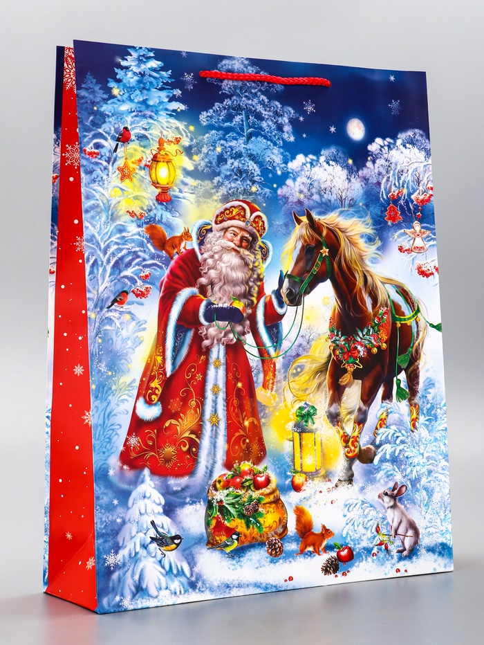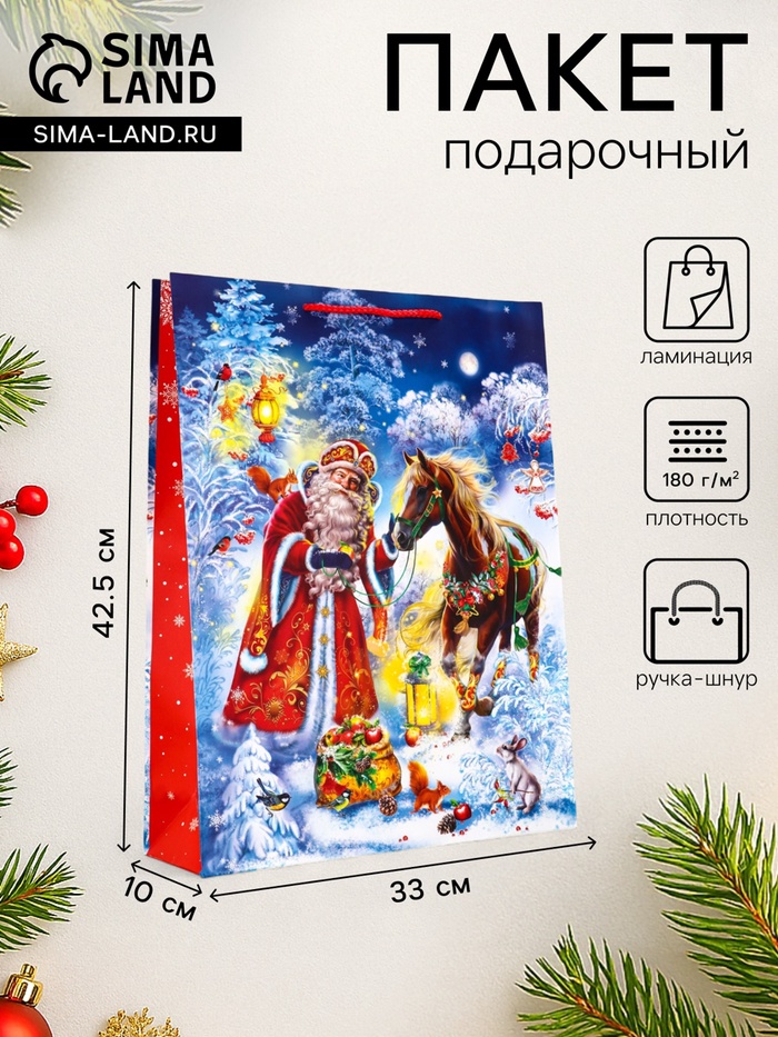 Пакет подарочный новогодний ламинированный, «Дед Мороз и Конь» , 33×10×42.5 см — Характеристики