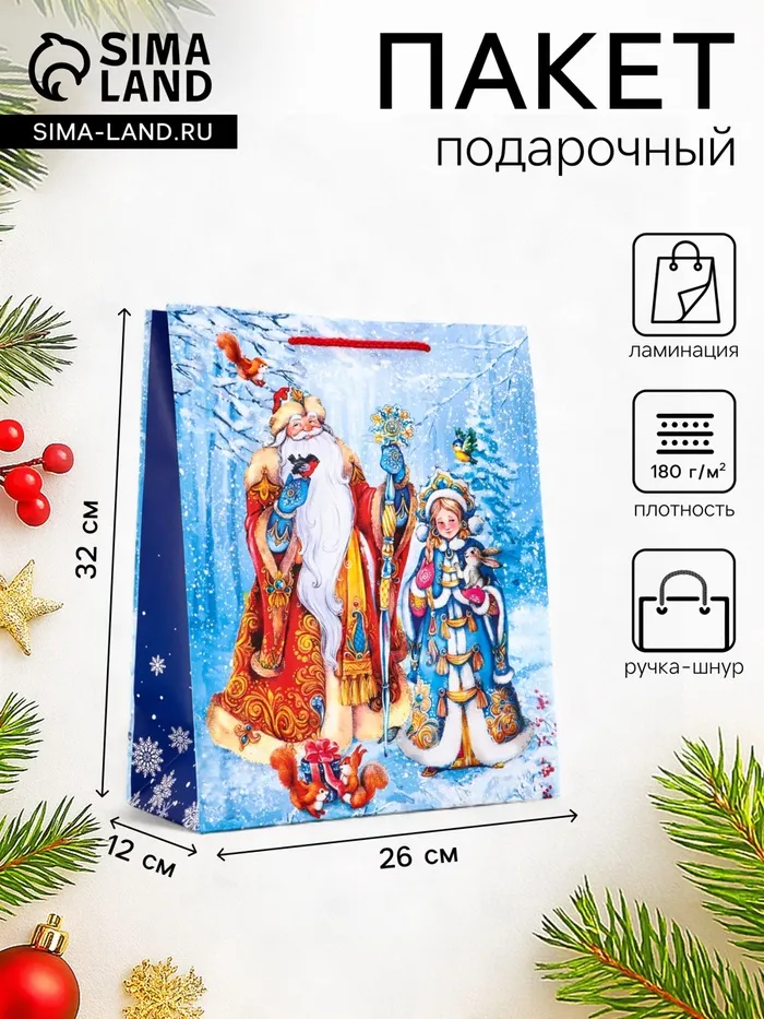 Пакет подарочный новогодний ламинированный, «Дед Мороз и снегурочка» , 26×12×32 см — Характеристики