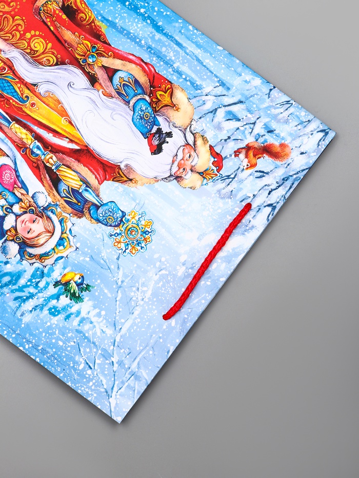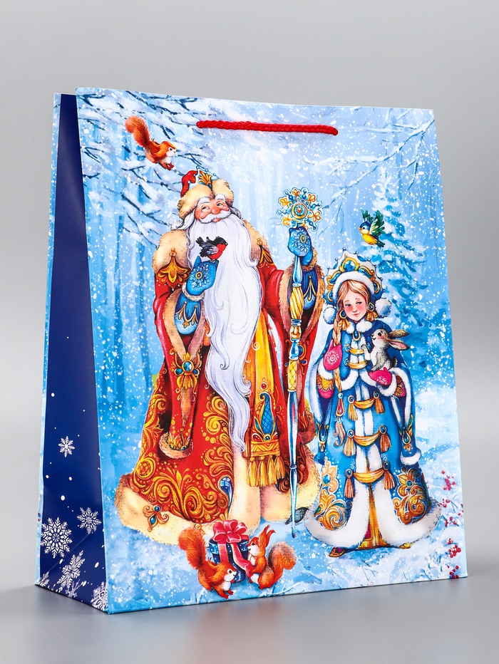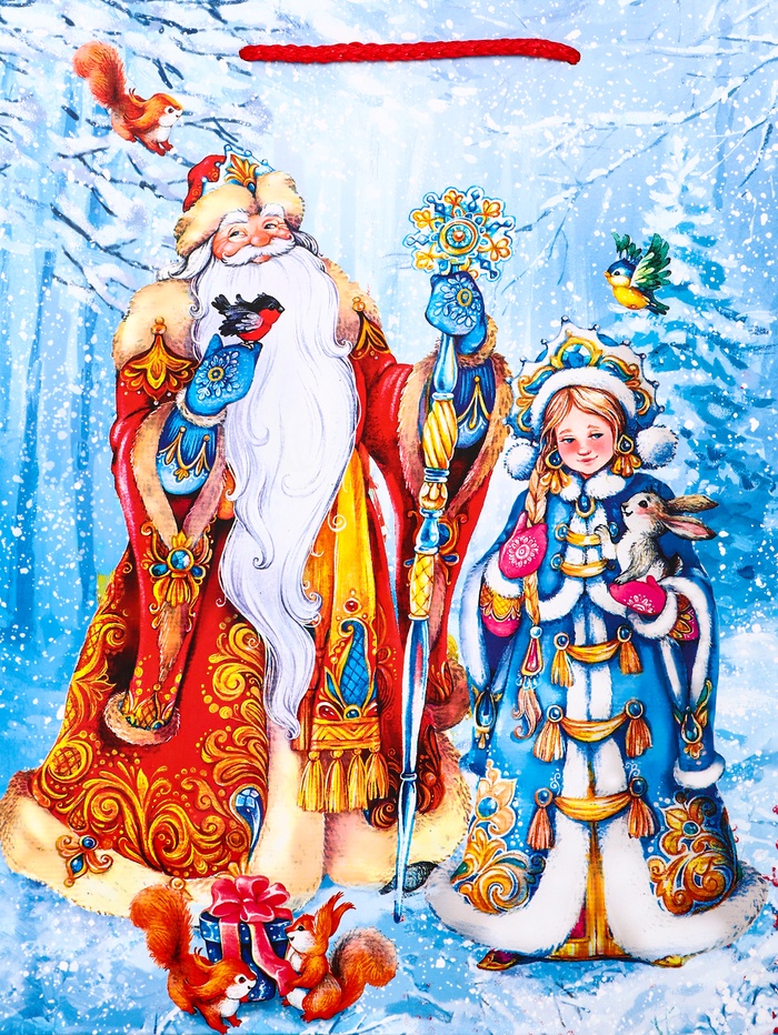 - Универсальный дизайн: Классическое изображение Деда Мороза и Снегурочки на нежно-голубом фоне подойдет для подарка и девочке, и мальчику. Этот пакет станет ярким акцентом под елкой.