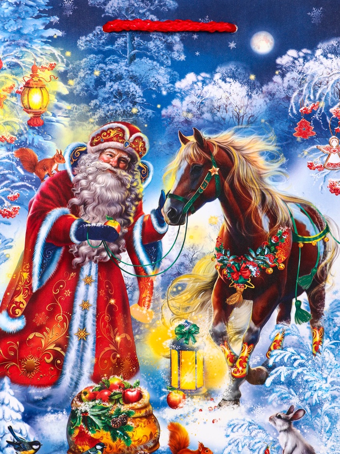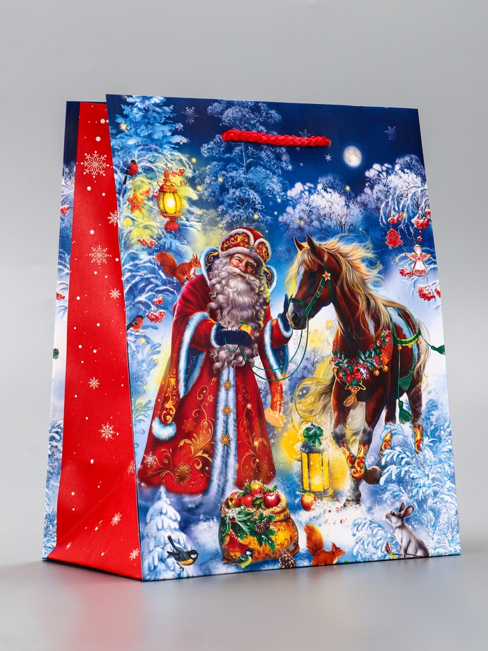 Создайте праздничное настроение с традиционным сюжетом! Подарочный пакет «Дед Мороз с Конём» — это ламинированная упаковка для новогодних презентов. Классическое изображение зимнего сюжета создаёт атмосферу сказки и праздника.
