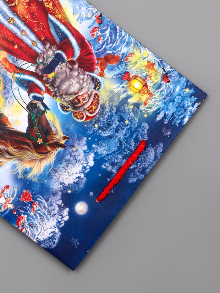 Для праздничных моментов: Яркое оформление с традиционным сюжетом сразу создаёт новогоднее настроение. Пакет «Дед Мороз с Конём» — готовое решение для быстрой и красивой упаковки праздничных презентов.