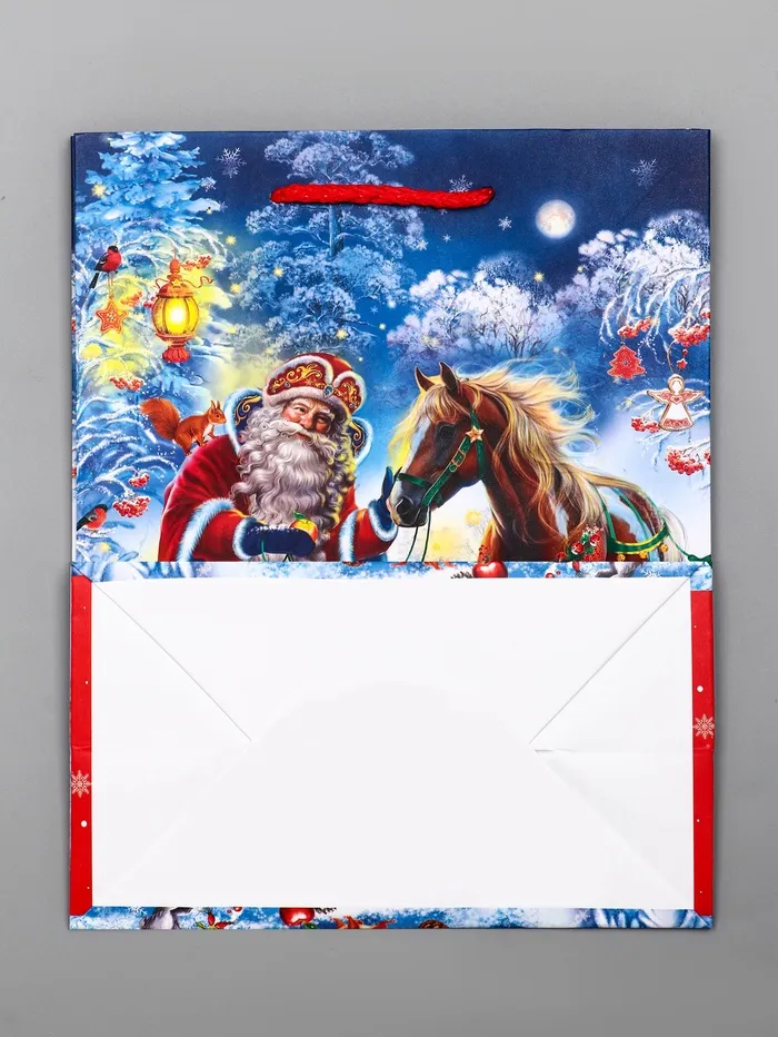 Для праздничных моментов: Яркое оформление с традиционным сюжетом сразу создаёт новогоднее настроение. Пакет «Дед Мороз с Конём» — готовое решение для быстрой и красивой упаковки праздничных презентов.