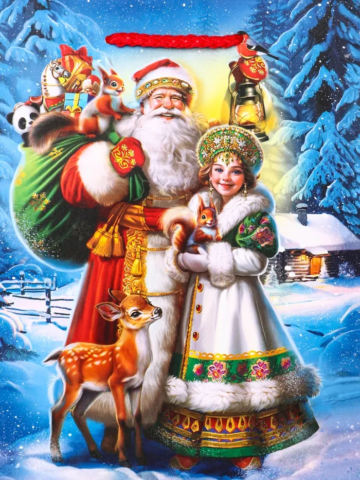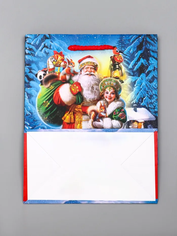 Идеальный выбор для подарков-сюрпризов: Этот пакет особенно подходит для презентов, которые дарят с особым эмоциональным посылом. Сценарий с Дедом Морозом, несущим подарки, напоминает о самом волнующем моменте праздника — разворачивании сюрпризов. «Дед Мороз с подарками» — это упаковка, которая усиливает ожидание праздничного чуда.