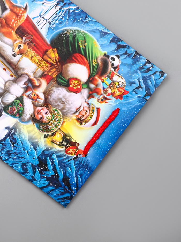 - Сюжетный праздничный дизайн: Динамичное изображение Деда Мороза с подарками передаёт ощущение движения и предвкушения. Универсальный дизайн подходит для презентов всем — от детей, ждущих чудес, до взрослых, ценящих момент дарения.