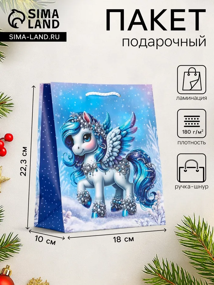 Пакет подарочный новогодний ламинированный, «Единорог» , 18×10×22.3 см — Характеристики