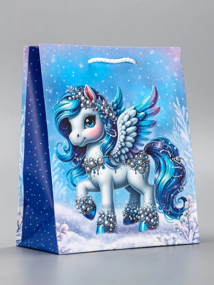 Для волшебных моментов: Сказочное оформление с единорогом добавляет подарку ощущение чуда. Пакет «Единорог» — готовое решение для тех, кто хочет подарить близким не просто презент, а частичку новогоднего волшебства.