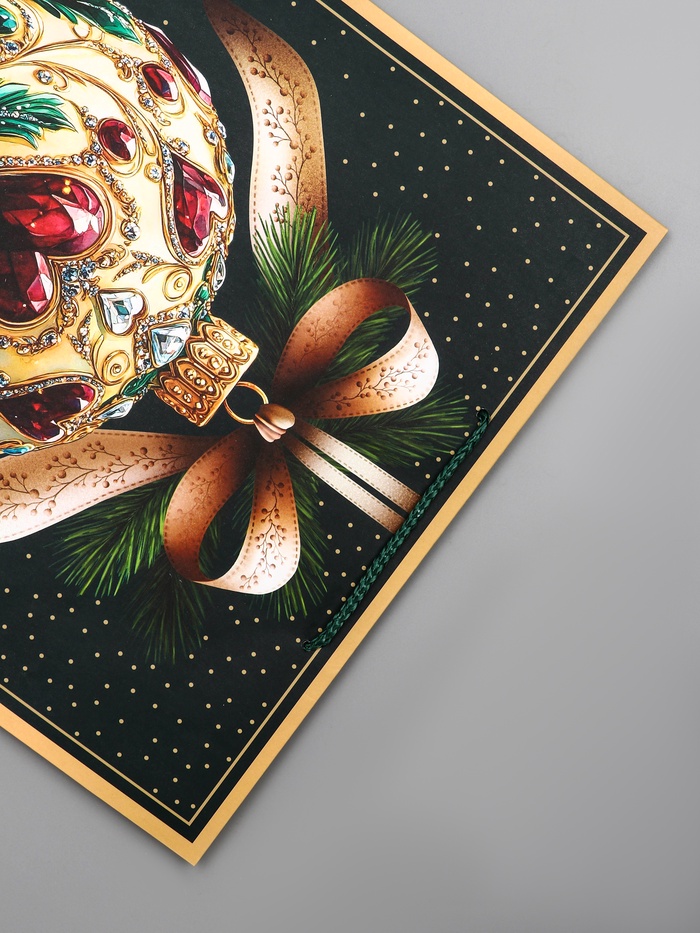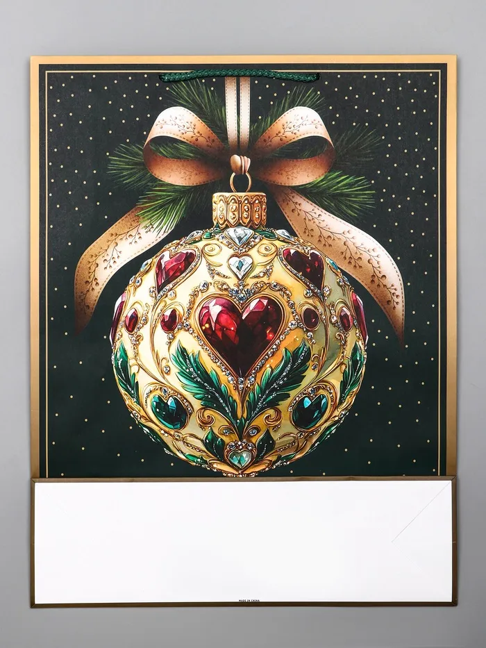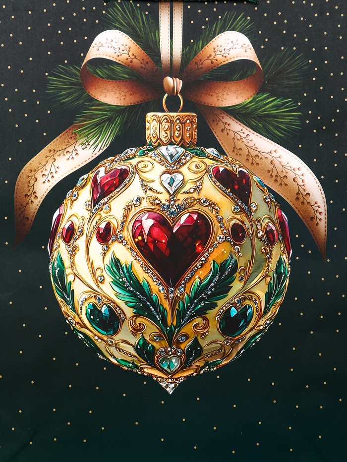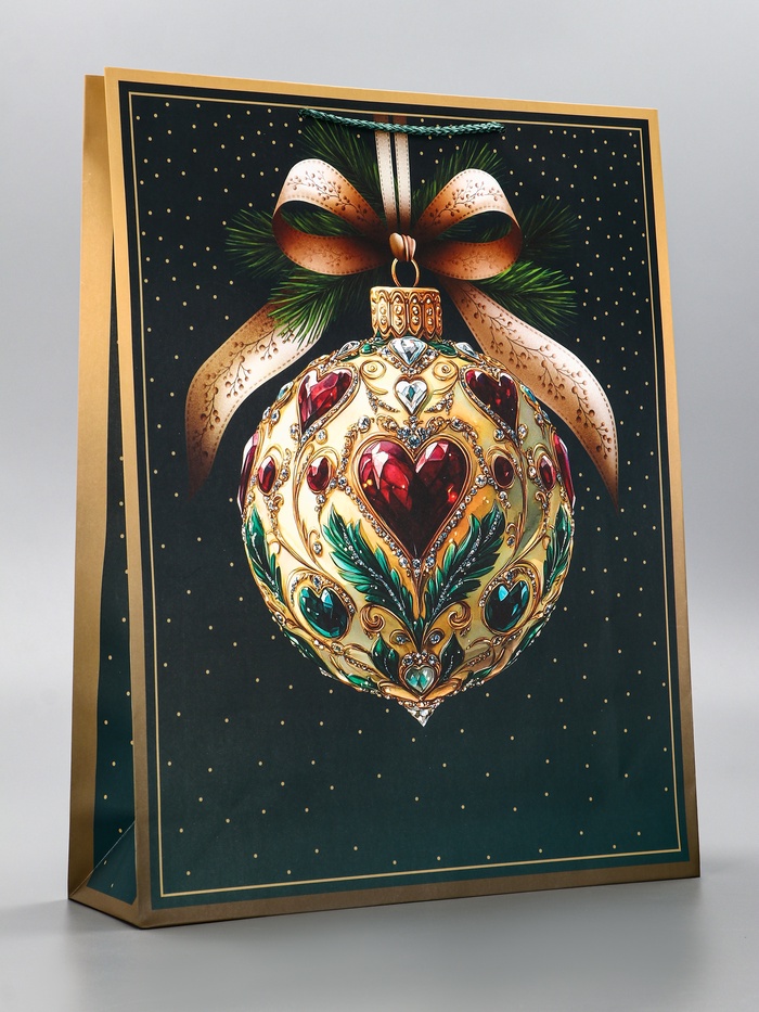 Традиционное решение для новогодних подарков: Этот пакет подходит для упаковки большинства праздничных презентов. Классический мотив елочных игрушек напоминает о главных атрибутах праздника, создавая ощущение домашнего уюта и зимней сказки. «Елочный шар» — это упаковка, которая говорит о любви к традиционному Новому году.