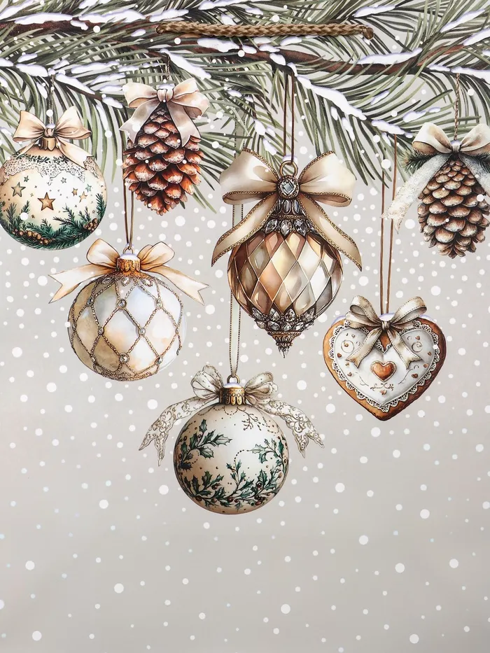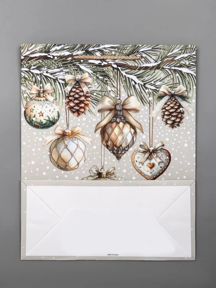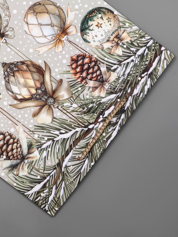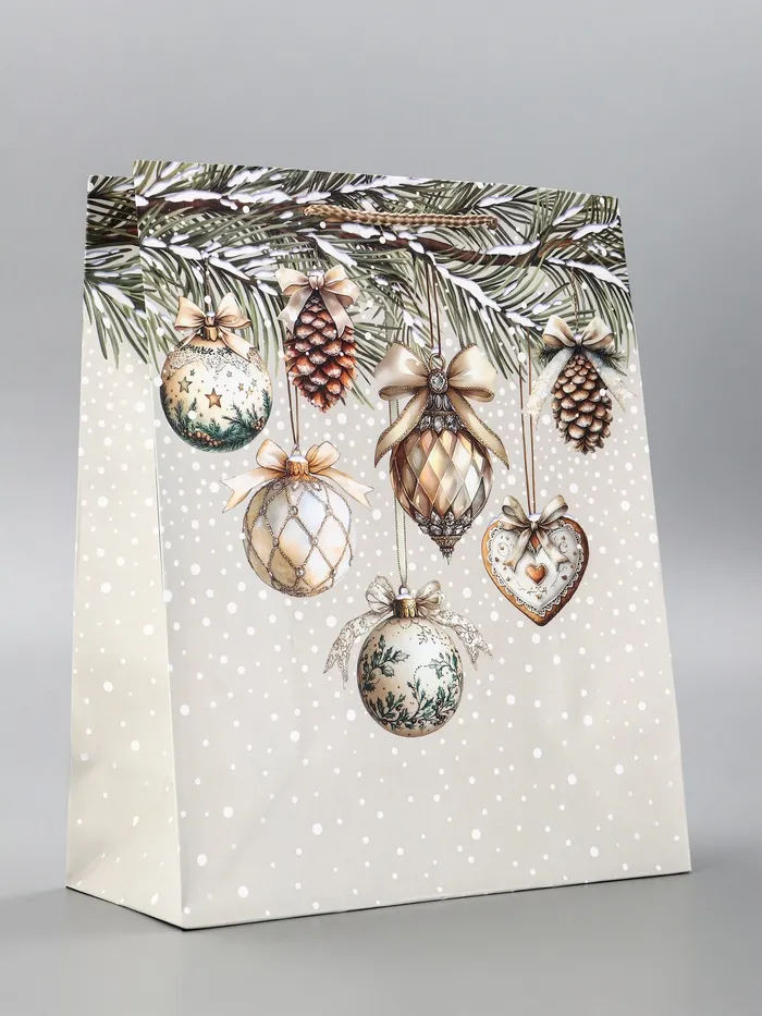- Современный дизайн: Серебристый фон с изображением елочных игрушек создает атмосферу современного праздника. Универсальное оформление подходит для подарков и женщинам, и мужчинам.